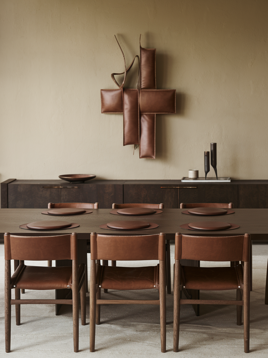 Leather accents, such as placemats or decor items, add richness to the dining room. Brown leather enhances warmth and texture. Used sparingly, leather elevates the space without overpowering it. This detail adds refinement and cohesion.