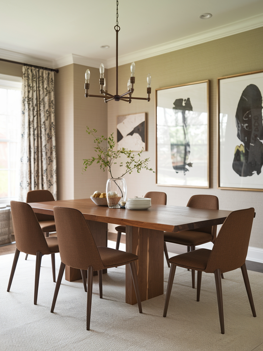 Elegant artwork plays a crucial role in elevating a brown dining room, transforming it from simply warm to thoughtfully curated. Brown interiors provide an ideal backdrop for artwork because their richness allows both neutral and colorful pieces to stand out without clashing. Art in soft earth tones, muted abstracts, landscapes, or monochromatic compositions complements brown walls and furniture beautifully while adding personality and visual focus. Larger statement pieces above sideboards or along feature walls help anchor the space, while smaller gallery-style arrangements create an intimate, collected feel. Frames in wood, bronze, or matte black enhance cohesion and sophistication. When artwork is chosen with intention, it introduces contrast, scale, and emotion, making the dining room feel layered, refined, and reflective of personal style rather than purely decorative.