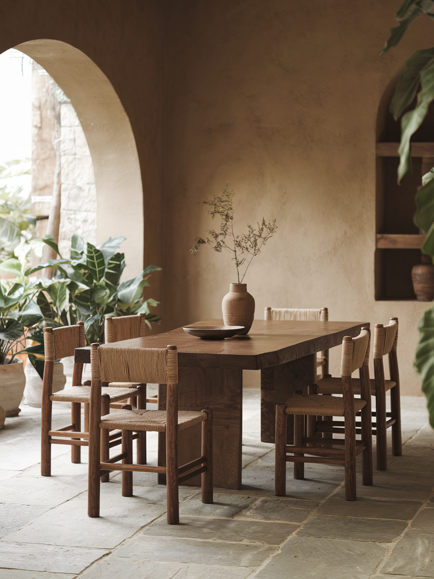 A warm walnut dining table serves as a stunning centerpiece that grounds the entire dining room. The natural grain and rich brown tone add depth, character, and organic beauty. Walnut tables feel elegant yet approachable, making them suitable for both formal dinners and casual family meals. Their versatility allows them to pair beautifully with upholstered chairs, leather seating, or even mixed materials like metal and fabric. When surrounded by neutral walls or soft lighting, the table becomes the heart of the room without overpowering it. A walnut dining table elevates the space through craftsmanship and natural warmth, creating a balanced and inviting dining environment.