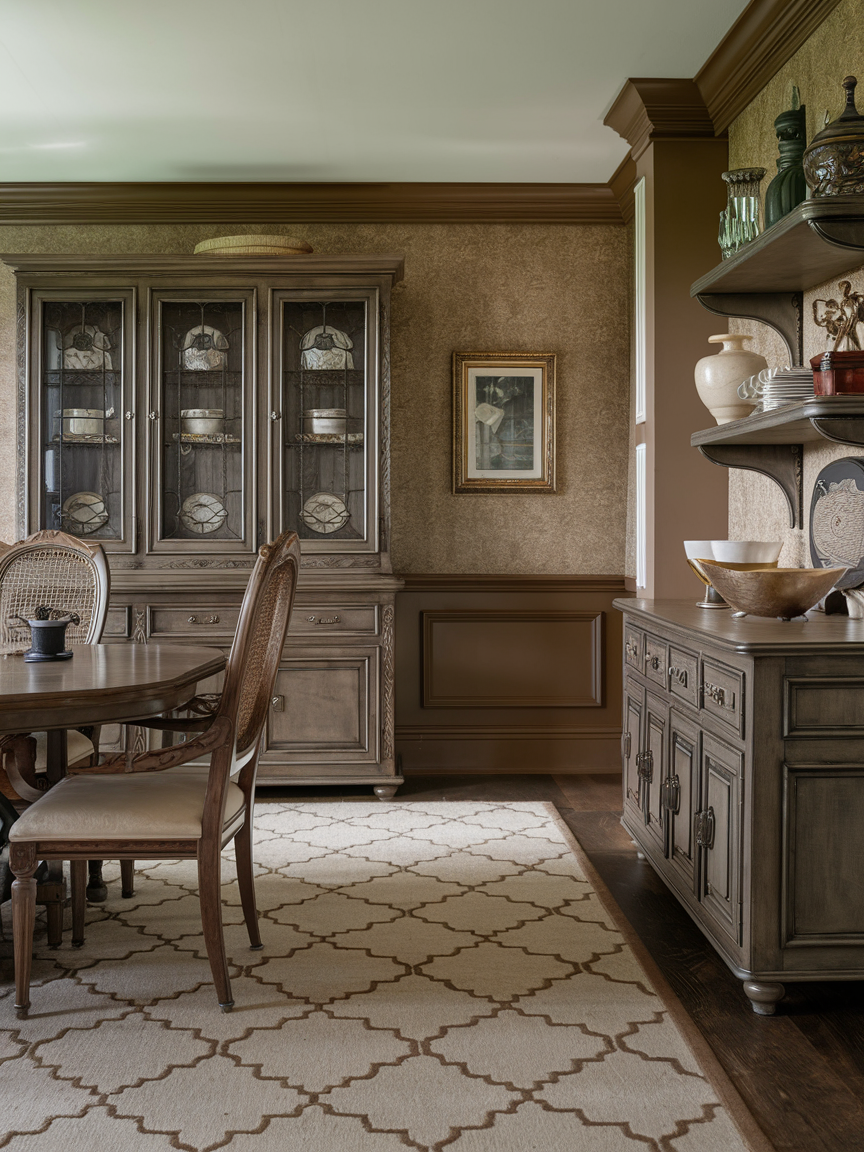 Incorporating subtle patterns within a brown dining room adds visual interest while preserving elegance. Patterns can appear through textiles, rugs, wallpaper, or upholstered seating, introducing movement and depth without overwhelming the space. When patterns stay within a warm brown, beige, or taupe palette, they enhance cohesion rather than compete for attention. This approach works beautifully in classic and transitional dining rooms, where refined detail matters. Subtle pattern play elevates the design by adding complexity and texture, making the space feel layered, thoughtful, and visually engaging while remaining timeless.