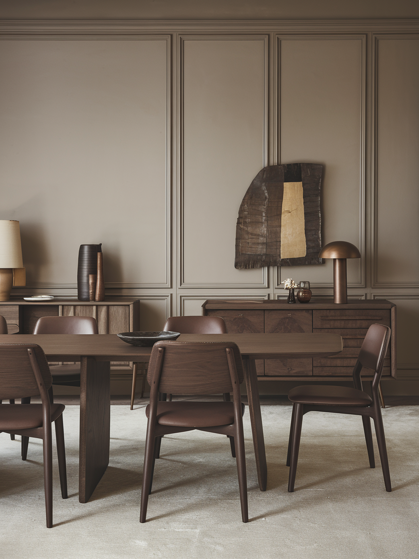 Brown brings a sense of warmth, depth, and quiet sophistication to dining room interiors, making it a timeless choice for elegant spaces. This versatile color ranges from soft taupe and warm caramel to rich walnut and deep espresso tones, each capable of creating a dining room that feels inviting yet refined. When paired with the right materials and lighting, brown adds character without overpowering the space.