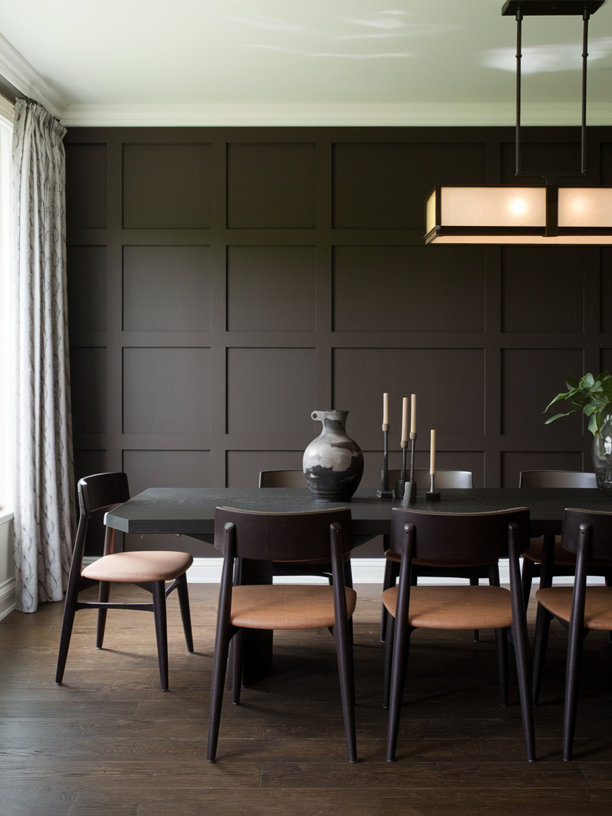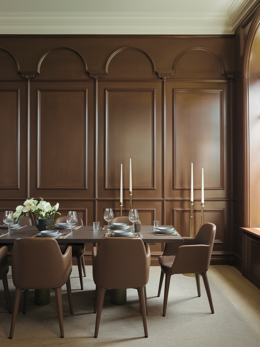 Brown wall paneling brings architectural depth and refined character to a dining room. Whether traditional or modern in style, paneling adds texture and structure that elevate the space beyond simple painted walls. Brown tones enhance the sense of warmth while maintaining a formal, sophisticated feel. This design works especially well in dining rooms with high ceilings or ample natural light. When paired with minimal decor and warm lighting, brown paneling feels timeless and elegant rather than ornate. It creates a dining environment that feels thoughtfully designed and visually engaging.