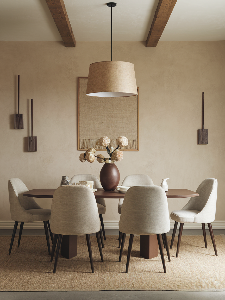 Layering multiple shades of brown creates a dining room that feels rich, cohesive, and visually dynamic. Combining light taupe walls, medium-toned wood furniture, and darker brown accents prevents monotony while maintaining harmony. This approach adds dimension and sophistication without relying on bold colors. Texture plays a key role—mixing leather, wood, fabric, and woven elements enhances the layered effect. Neutral accents like cream or beige help soften transitions between tones. A well-layered brown palette feels elegant and intentional, making the dining room warm, refined, and timeless in its appeal.