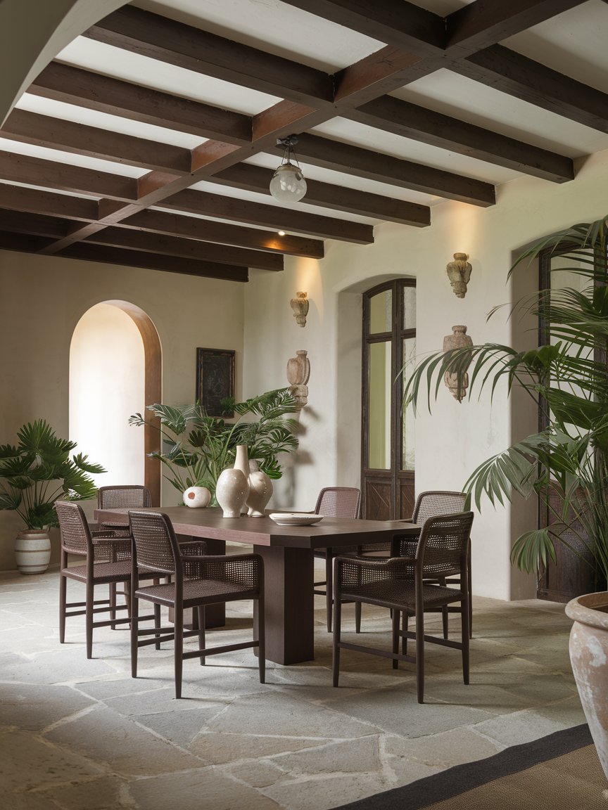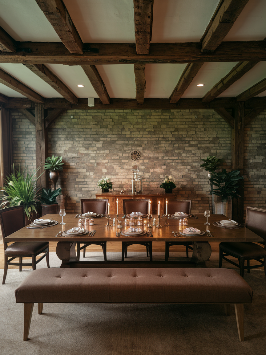 Exposed brown wood ceiling beams add character and timeless charm to a dining room. They introduce architectural interest and emphasize ceiling height while reinforcing warmth. Brown beams pair beautifully with neutral walls, stone floors, or classic furniture. This design choice works particularly well in traditional, farmhouse, or transitional interiors. Soft lighting enhances the texture and grain of the wood, creating a cozy yet elegant atmosphere. Ceiling beams bring history and craftsmanship into the space, elevating the dining room with understated sophistication.