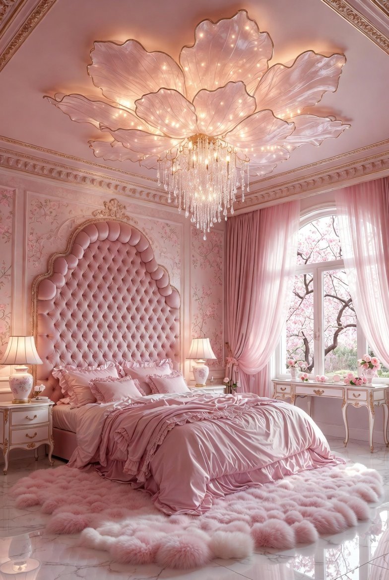 This breathtaking pink sanctuary is pure fairy-tale elegance. The ceiling becomes the star of the show with an enormous translucent flower medallion, softly illuminated by warm LED backlighting. At its center, a dripping crystal chandelier cascades light throughout the room, reflecting beautifully against glossy surfaces. Behind the bed, a full wall of pink velvet tufted bubbles creates rich texture and visual depth. The high tufted headboard blends seamlessly into layered pink satin bedding adorned with ruffled pillows, adding softness and romance. A massive arched window dressed in sheer pink curtains and heavy drapes frames a picturesque view of blooming cherry trees. Underfoot, a fluffy cloud-like pom-pom rug rests atop reflective white marble tiles, enhancing the ethereal glow.