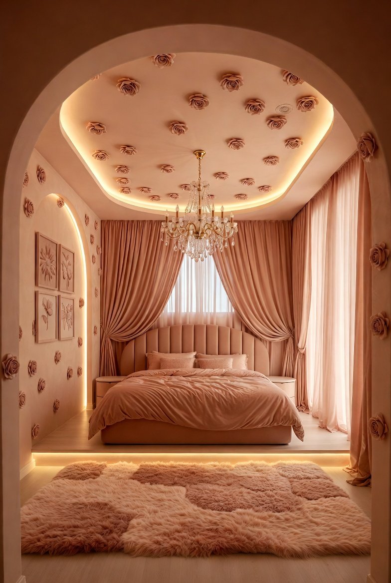 For a slightly warmer take on feminine luxury, this peach-toned retreat delivers dreamy sophistication. The recessed oval ceiling is trimmed with warm LED lighting, while delicate 3D rose appliqués scatter across both the ceiling and arched walls for a sculptural effect. A crystal chandelier anchors the room, adding sparkle against the soft peach hues. The rounded tufted bed platform, complete with under-bed lighting, appears to float above a fluffy pom-pom rug layered over light wood floors.