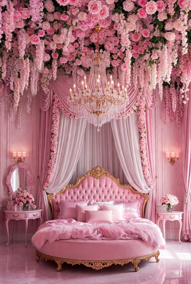 If maximalism is your style, this lavish pink bedroom transforms florals into architectural art. The ceiling overflows with thick pink roses, peonies, and cascading wisteria vines, surrounding a gold crystal chandelier that glimmers among the blooms. At the center of the room sits a round button-tufted pink velvet bed crowned by a gilded Baroque-style headboard. Layers of silk pillows and plush throws enhance the indulgent feel. A sheer white canopy, tied delicately with pink roses, drapes gracefully around the bed.