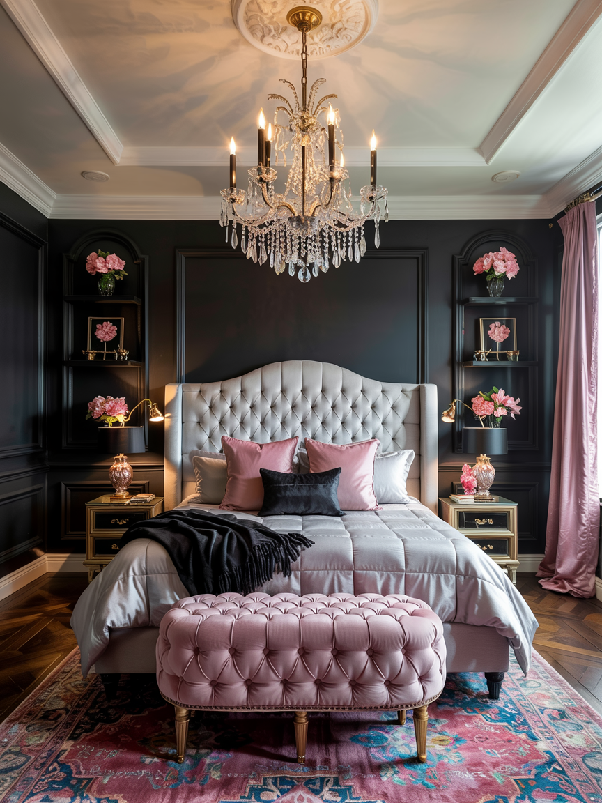For a more sophisticated take on princess glamour, this design pairs deep black architectural paneling with soft pink accents. The recessed ceiling showcases an elaborate crystal chandelier featuring black candle details and pink prisms for subtle color play. A tufted dove-gray headboard anchors the bed, styled with pink velvet pillows and a sleek black throw. At the foot, a pink velvet bench and matching tufted ottoman add cohesion and comfort.