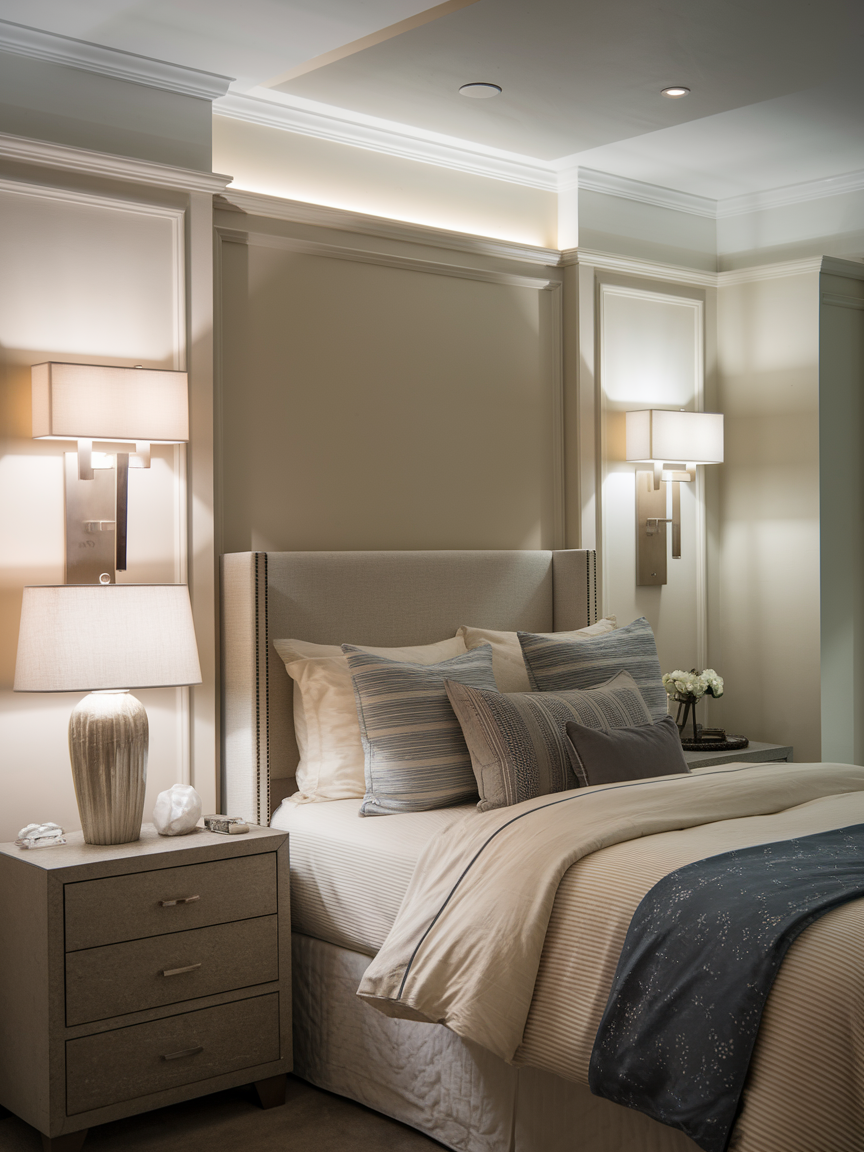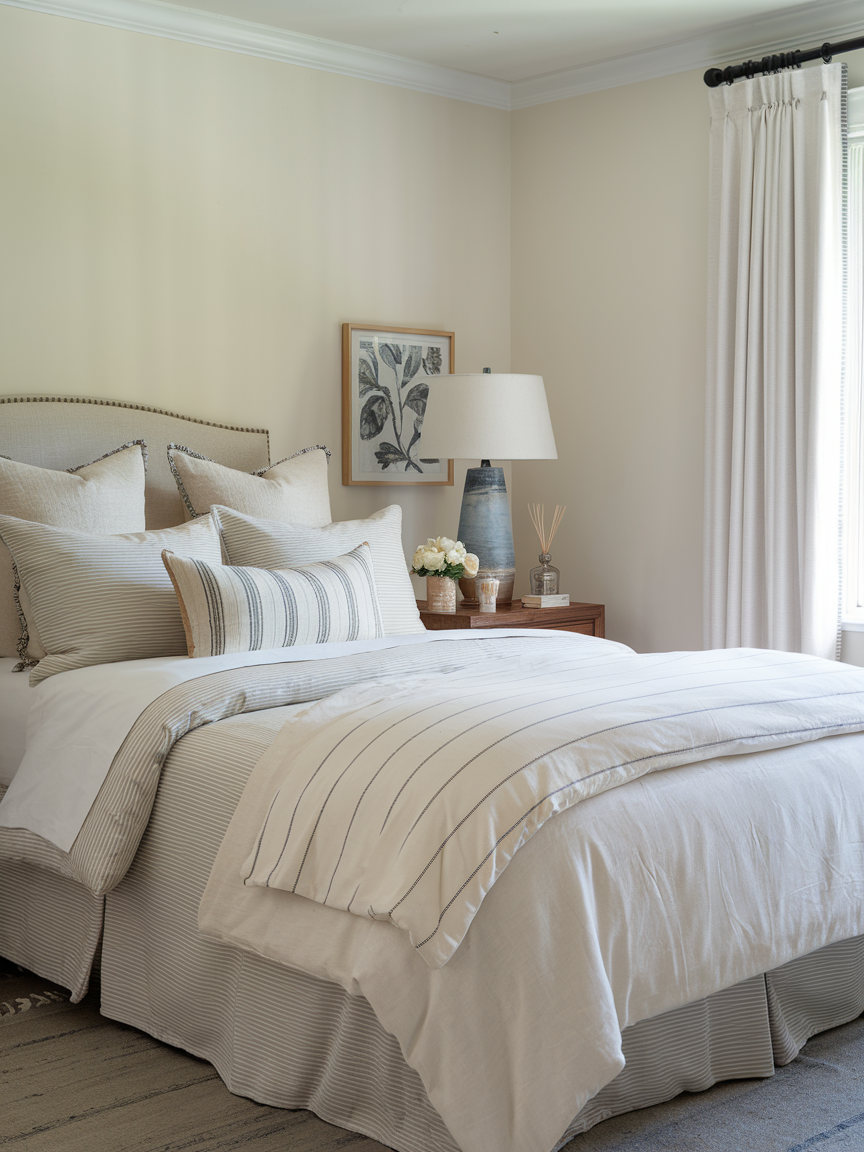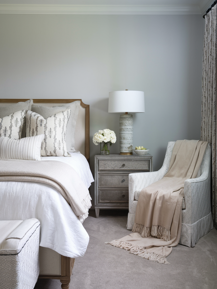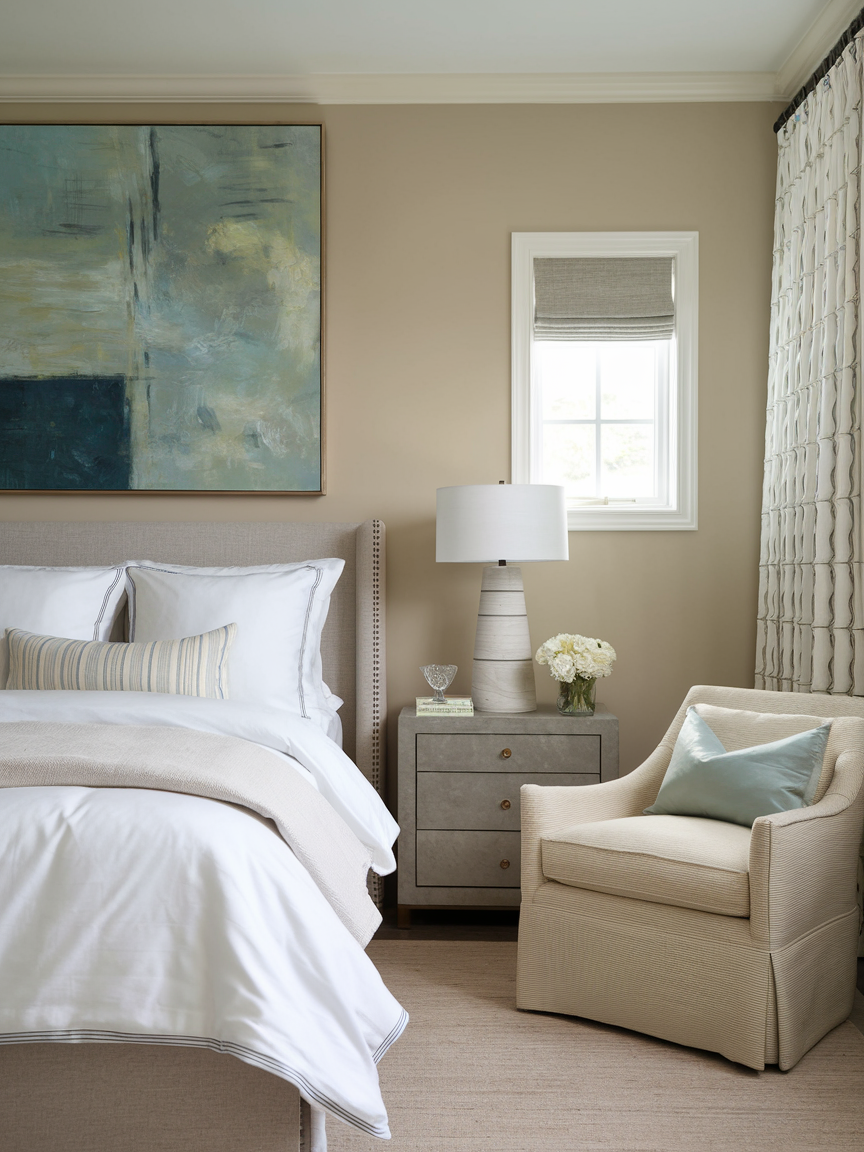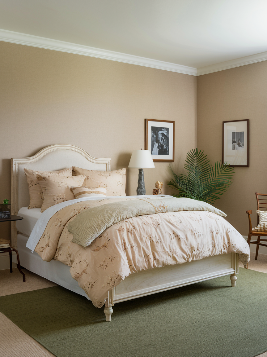 Neutral tones create a universally appealing and calming atmosphere. Soft whites, warm beiges, muted blues, or gentle grays provide a serene foundation that works for a wide range of tastes. A neutral backdrop also allows decorative accents, such as patterned pillows or artwork, to stand out gracefully. The result is a balanced space that feels airy, restful, and elegant without being overly personalized or overwhelming.
