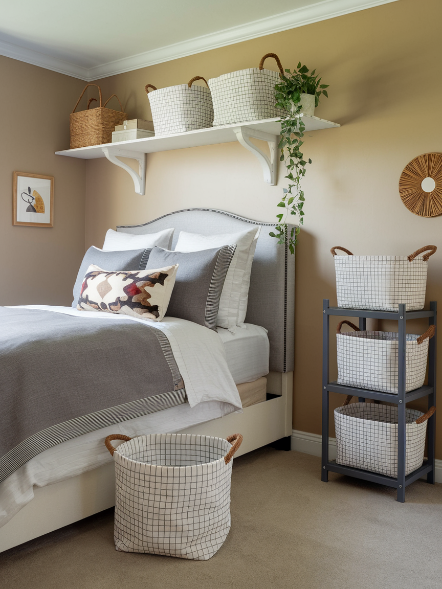 Storage baskets combine practicality with decorative appeal. Woven materials like rattan, seagrass, or wicker introduce natural texture that enhances warmth in the room. Use baskets to store extra blankets, pillows, or even spare towels for added convenience. Placing a medium-sized basket in an accessible corner allows guests to keep personal belongings neatly contained. The organic texture softens the space visually while maintaining organization. Stylish storage solutions prevent clutter from accumulating and help the room feel calm and intentional. These small details create a balance between functionality and design that guests will quietly appreciate.
