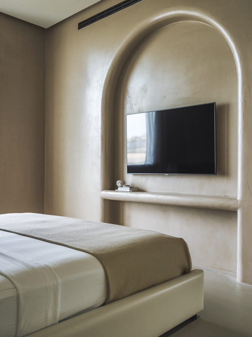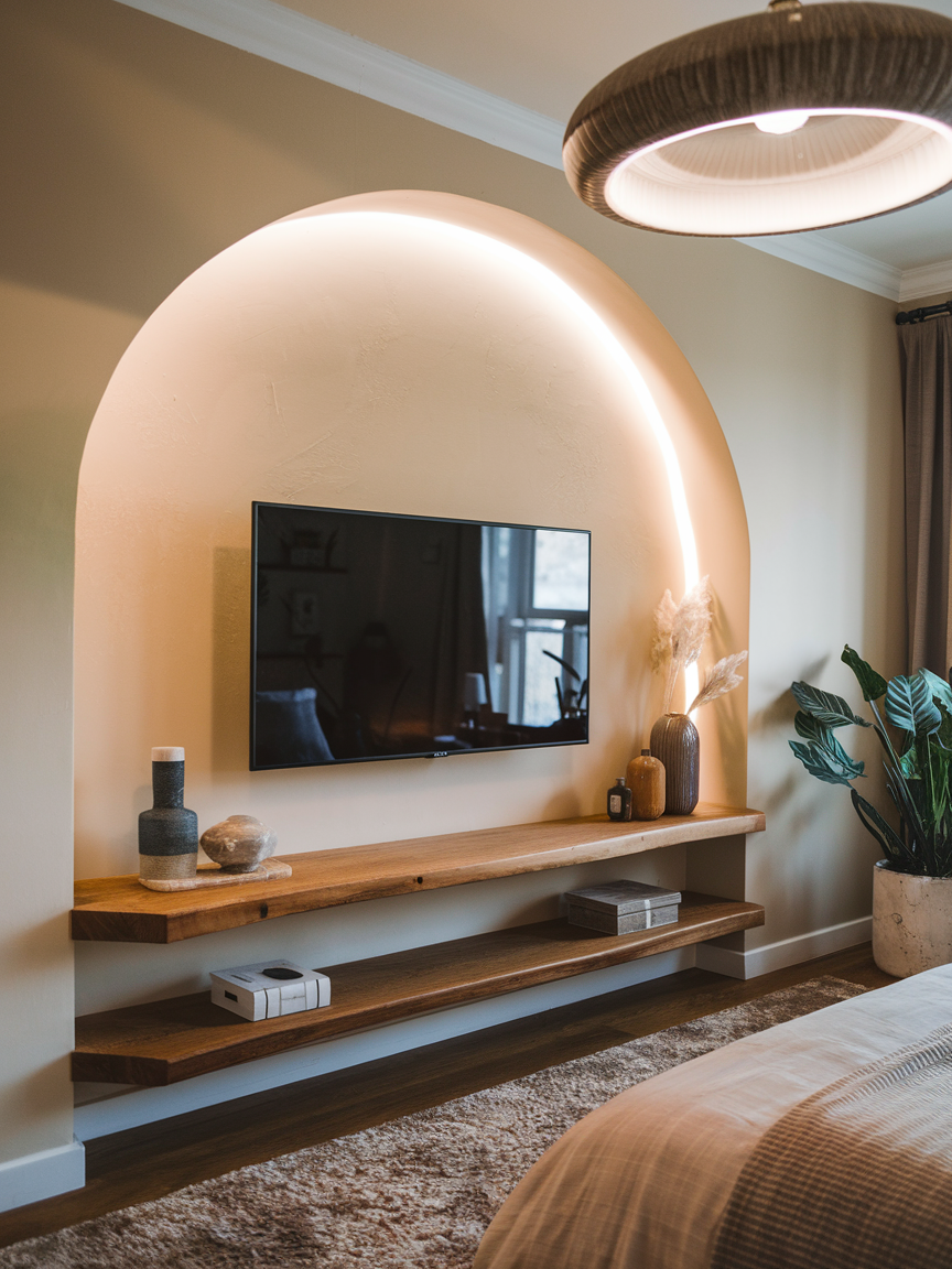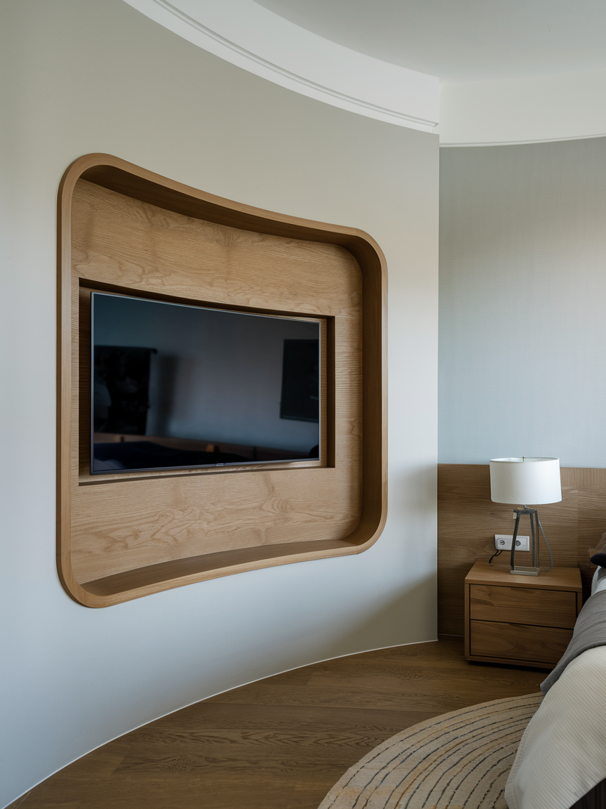 Integrating a TV into a curved wall niche can create a visually interesting feature in your bedroom. The curvature of the wall naturally draws the eye to the TV, making it feel like a built-in feature of the room. This setup works well in bedrooms with architectural elements like alcoves or arches, adding a touch of elegance and design sophistication. A curved niche helps the TV blend into the space seamlessly, while also offering a unique visual appeal.