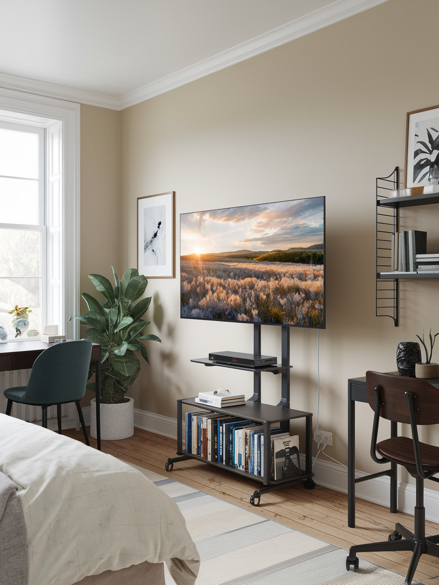 If you’re someone who loves versatility, a swivel stand is a game-changer. This type of TV stand allows you to easily rotate the TV to find the perfect viewing angle, whether you’re lying in bed or sitting in a chair across the room. The flexibility of a swivel stand makes it a great option for larger bedrooms or multi-functional spaces where you want the freedom to adjust your TV’s position. Additionally, swivel stands often come with built-in shelves or compartments for added storage, combining style and practicality.