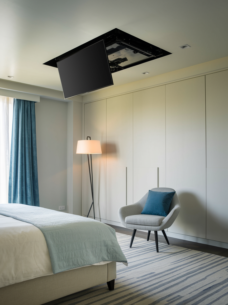 For a truly high-tech and luxurious feature, consider installing a hidden TV in the ceiling. When not in use, the TV remains hidden, giving the room an uncluttered, sleek look. With a remote-controlled mechanism, you can lower the TV from the ceiling for the ultimate cinematic experience. This innovative setup is perfect for bedrooms with high ceilings or those looking to incorporate cutting-edge technology into their home design. It combines style, convenience, and modern sophistication in one.