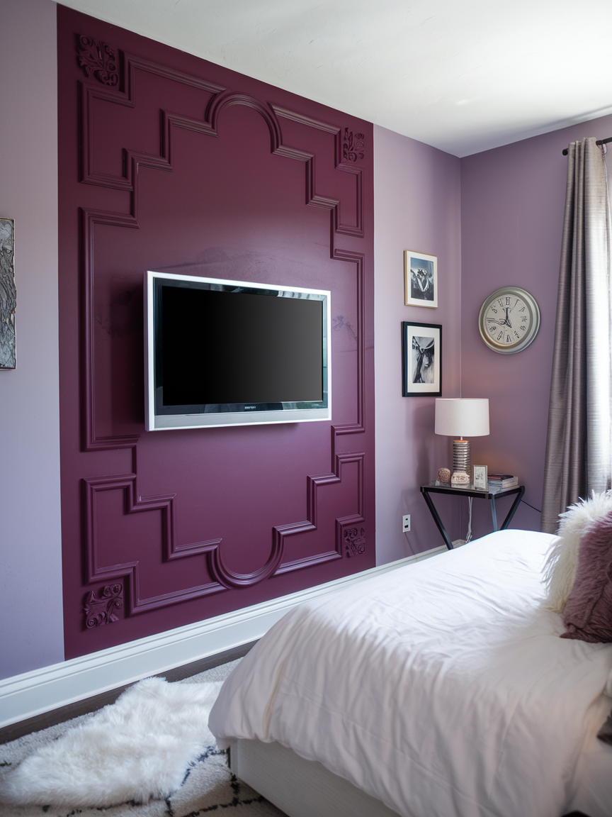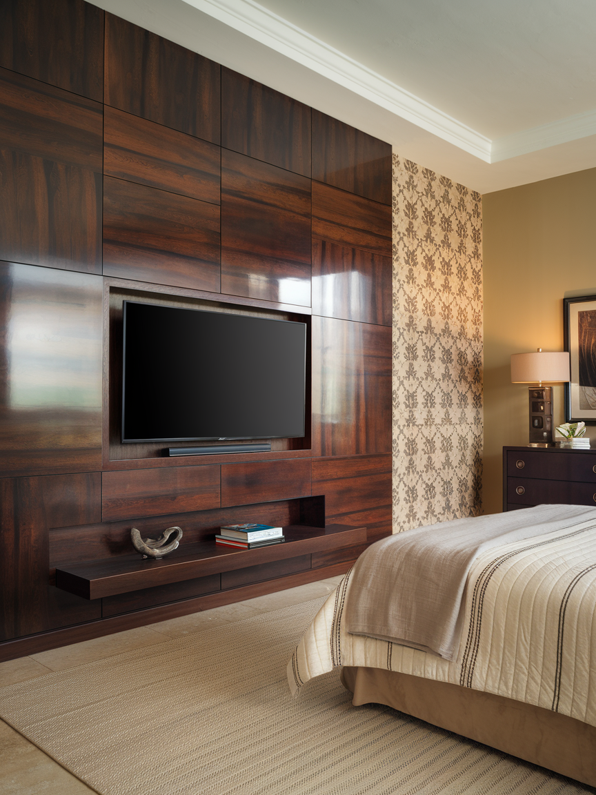 Make a bold statement with a TV mounted on a large panel wall. The paneling can be crafted from a variety of materials, such as wood or textured wallpaper, which adds a rich visual appeal to the room. This setup works especially well in large bedrooms where the TV can become the centerpiece of the wall. The paneling frames the TV beautifully, creating a dramatic and sophisticated focal point. You can choose a light, natural wood for a warm, rustic feel, or go for dark, polished wood or metallic finishes for a more contemporary or industrial vibe. The panel wall elevates the overall look of your bedroom while providing a functional space for your TV.