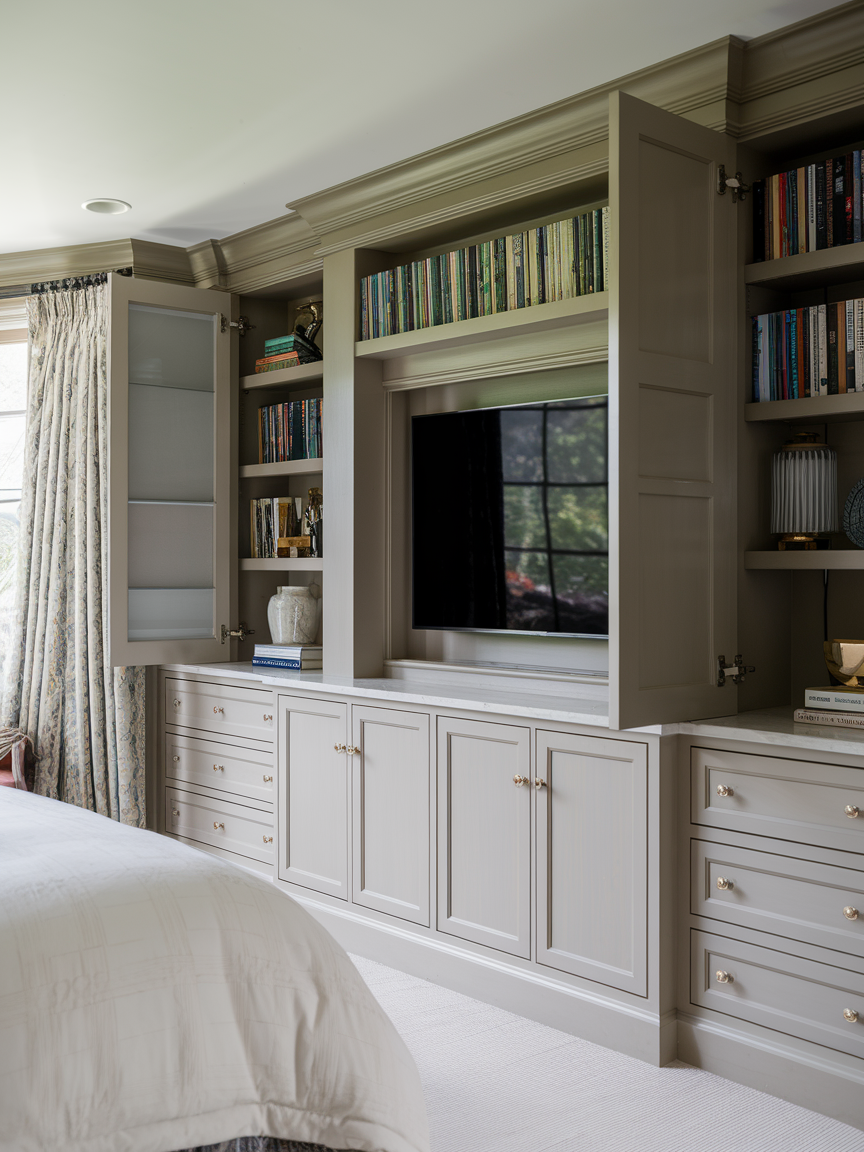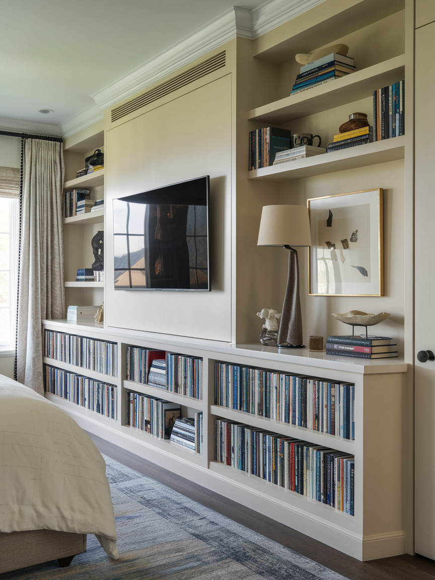 Maximize both your entertainment and storage with a built-in TV and bookshelf combo. This design integrates the TV seamlessly into your room while also offering plenty of storage space for books, decor, and other media accessories. Whether you go for open shelving or closed cabinets, this setup provides an organized, clutter-free space that’s both functional and stylish. It’s the perfect solution for those who want to combine the best of media storage and interior design in their bedroom.