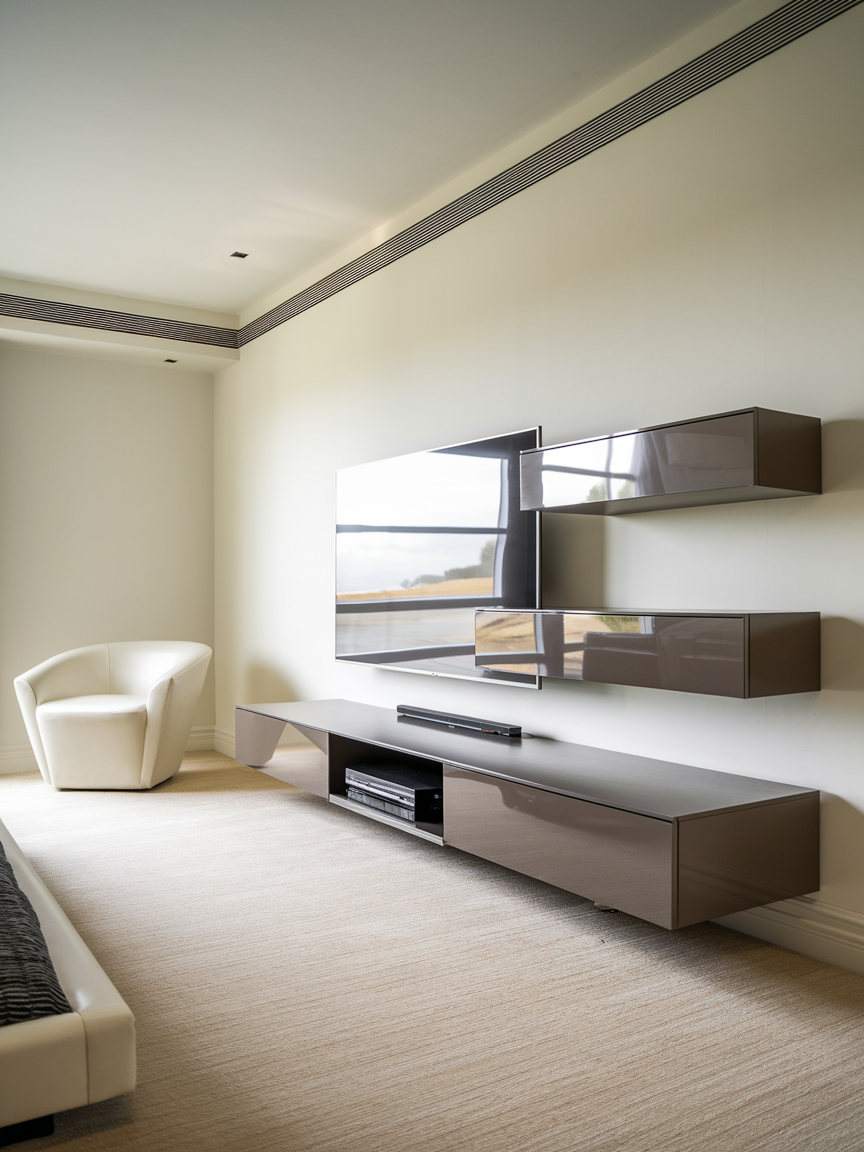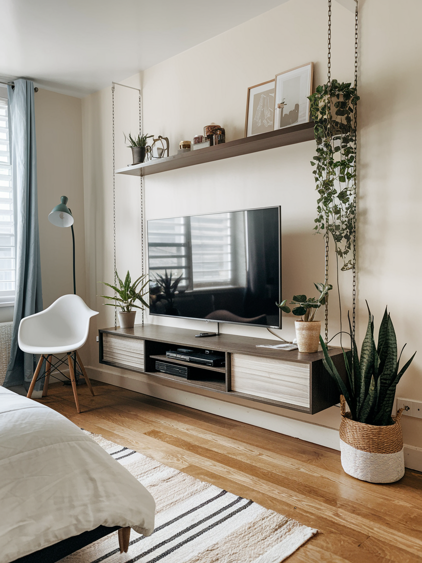 14. Minimalist TV Setup with Floating Shelves
