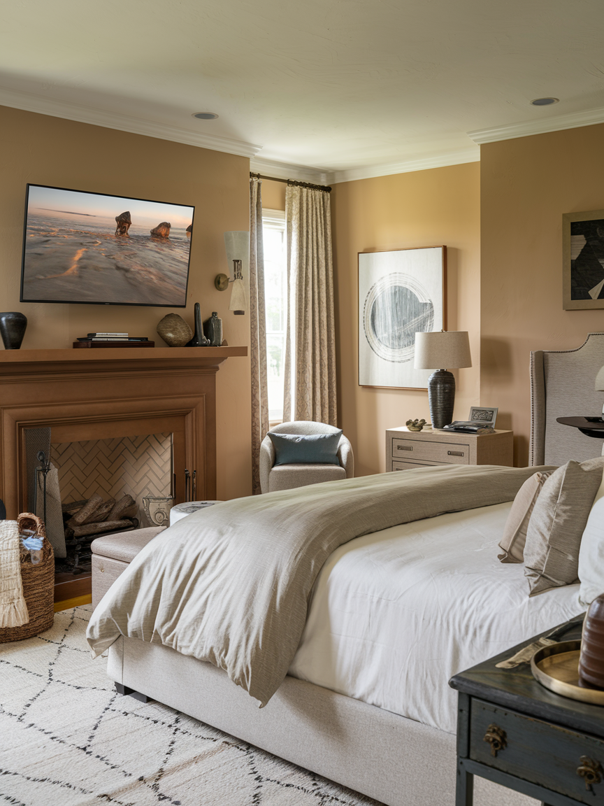 Mounting a TV above the fireplace is an excellent way to combine two elements of comfort and warmth. This setup brings a cozy, inviting atmosphere to your bedroom, especially during colder months when you want to relax in front of the fire while watching your favorite show. Pair the TV with a minimalist mantel or a simple, modern fireplace design to avoid overwhelming the space. This approach works particularly well in larger bedrooms where you can position the bed comfortably for a perfect viewing angle while enjoying the fire’s glow.