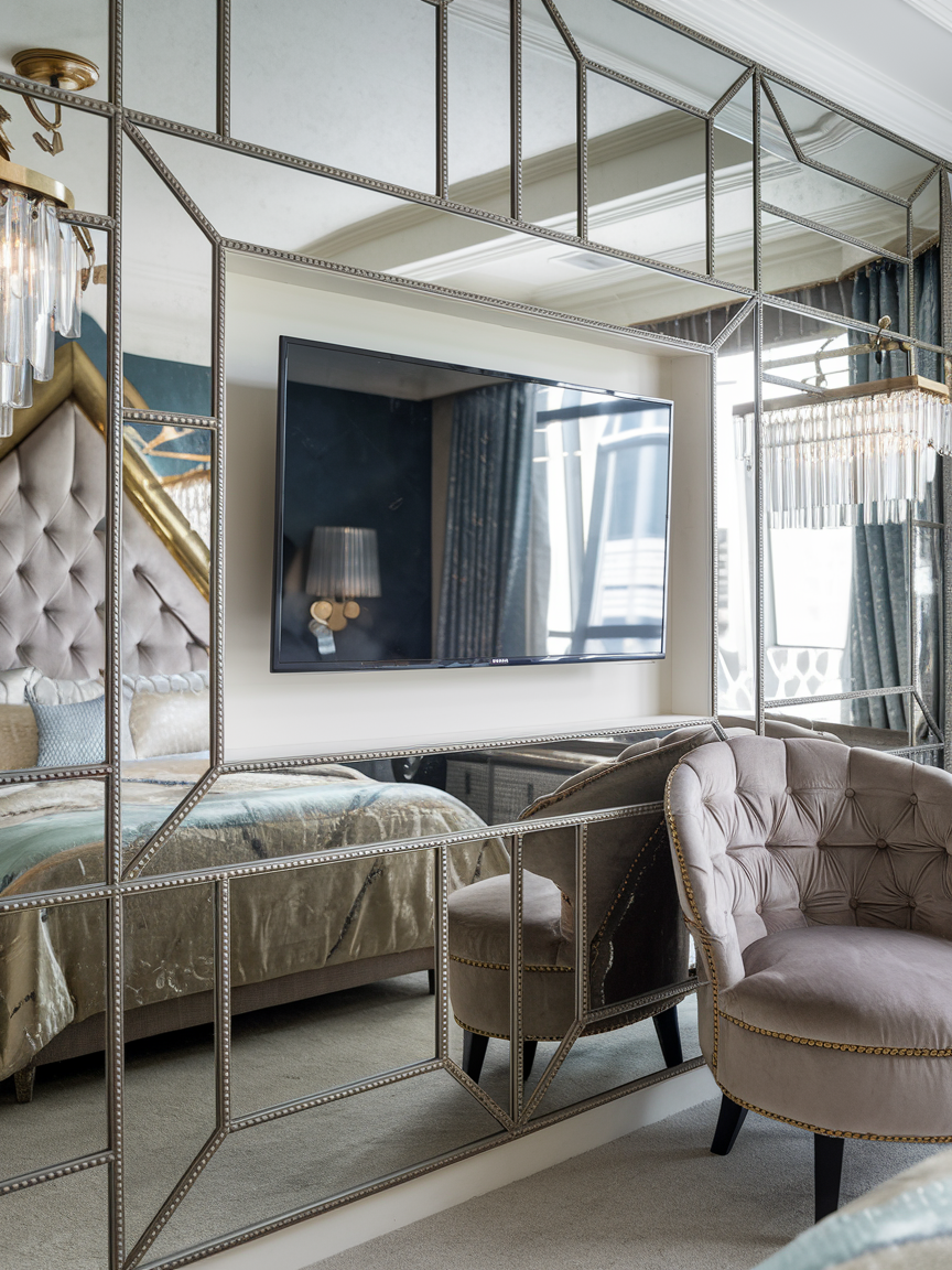 For those who want to add a glamorous, luxurious vibe to their bedroom, consider framing your TV with a mirrored frame. The reflective surface enhances the brightness and spaciousness of the room, making it feel more open and inviting. A mirrored frame adds an element of sophistication and class, especially when paired with luxe furniture like velvet upholstered chairs, crystal light fixtures, and metallic accents. This setup is perfect for creating a high-end look while still providing a functional space for TV viewing.