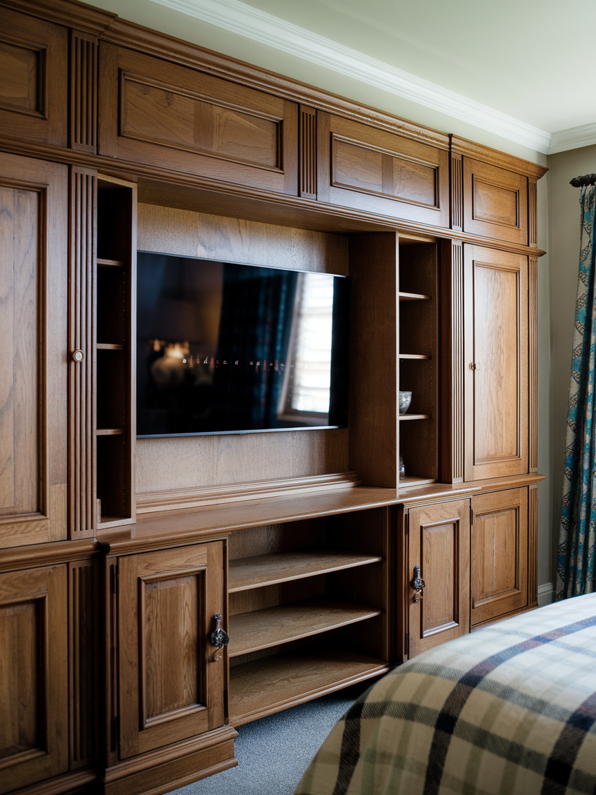 For a more classic, timeless approach, opt for a custom-built wooden cabinet to house your TV. This setup blends traditional design with modern technology, offering both style and practicality. Choose a cabinet with rich wood tones for a warm, inviting feel. The cabinet can feature doors that close, allowing you to conceal the TV when not in use, or you can keep it open for easy access. This design works well in more traditional bedrooms or those with vintage-inspired decor.