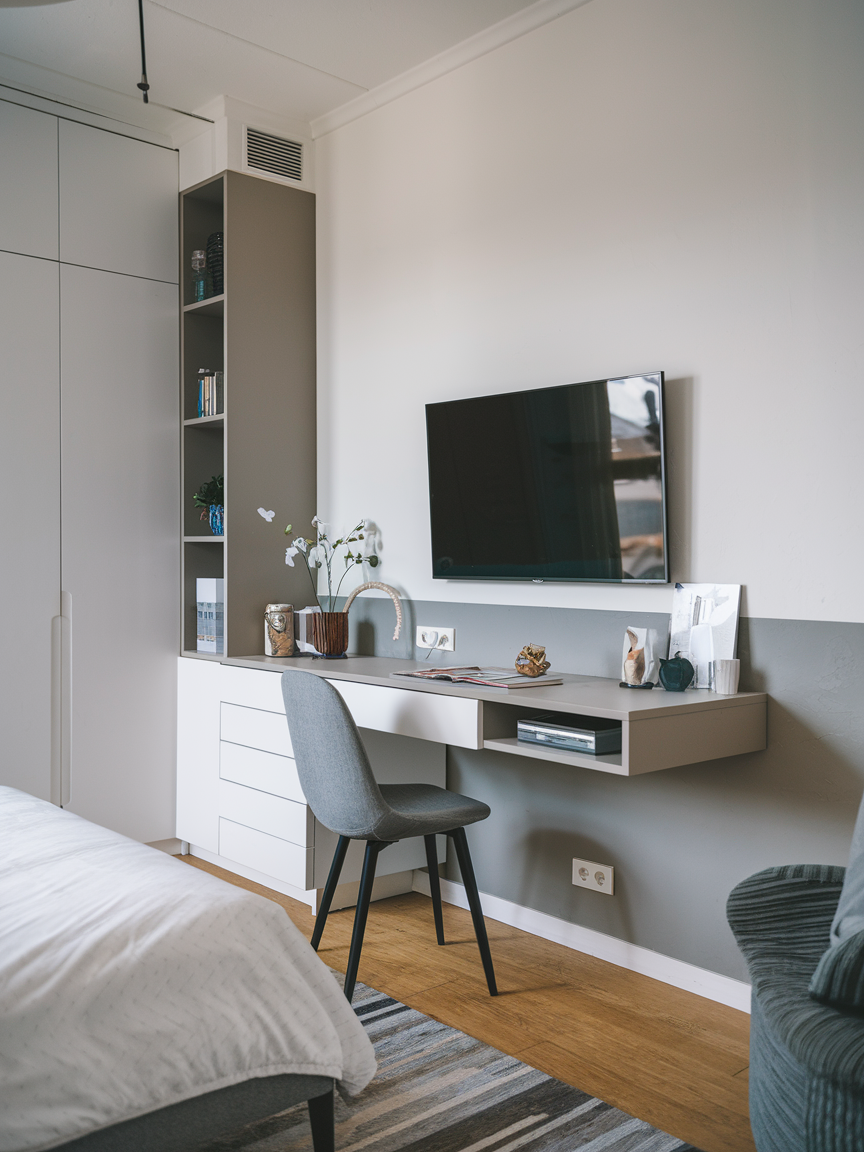 If you’re working with limited space, a floating desk with an integrated TV is a great way to save room while enhancing functionality. The TV can be mounted on the wall above or integrated into the desk itself, providing entertainment while also serving as a workspace. This dual-purpose setup is perfect for studio apartments or smaller bedrooms where maximizing space is essential. Pair it with ergonomic furniture to ensure comfort and productivity while enjoying your favorite shows.