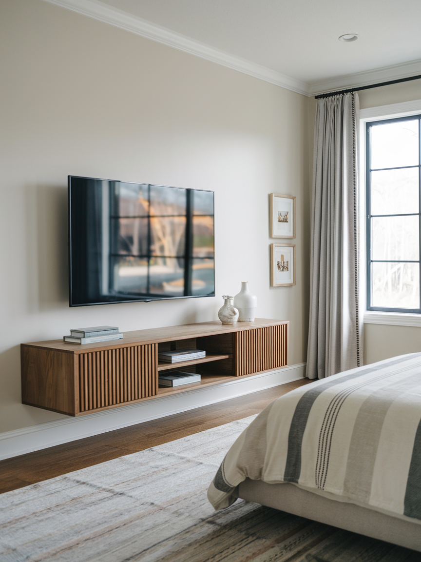 A floating media console with your TV provides an elegant, minimalist setup. The console offers hidden storage for your devices and accessories, while the floating design ensures that your bedroom maintains an open, airy feel. The floating feature also helps to visually elevate the room, making the space feel larger. You can customize the media console with different finishes, from wood to metal, to suit your room’s overall style.