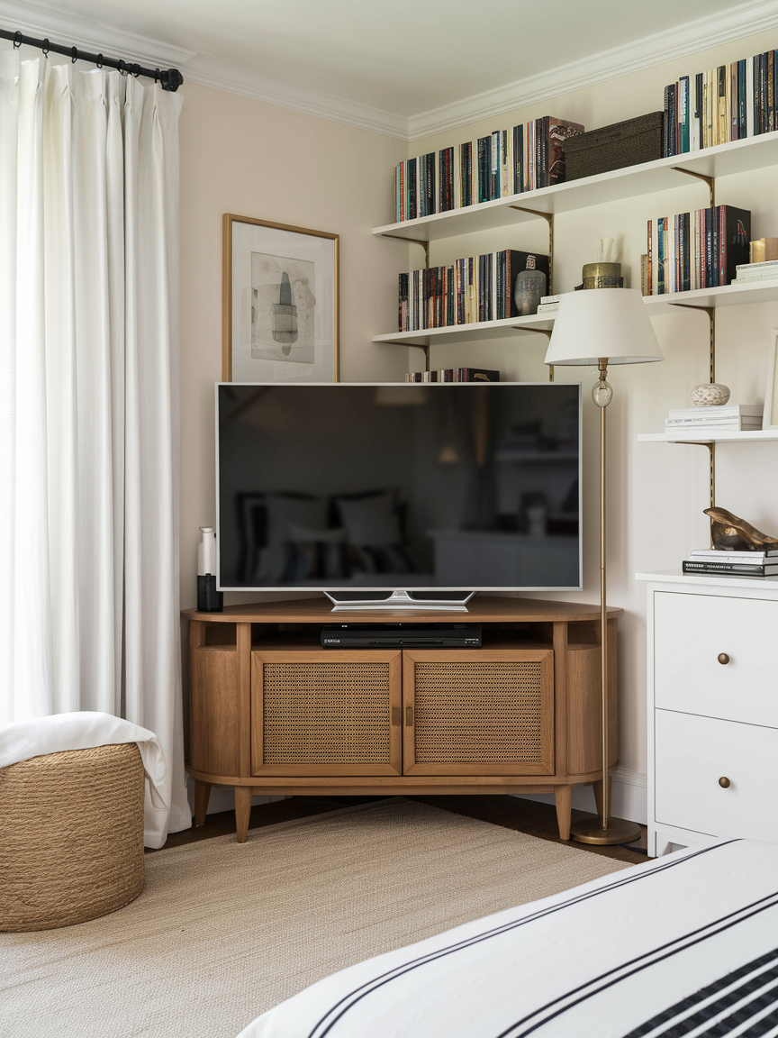 Sometimes, corners are the most underutilized spaces in a bedroom. A corner TV stand can help you make the most of this area while adding a functional design element to your room. Corner TV stands come in various styles, from traditional wood finishes to sleek, modern designs. They also offer additional storage space, such as shelves or cabinets, for media players, books, or decorative items. This setup works particularly well for smaller bedrooms or spaces where you want to optimize every inch.