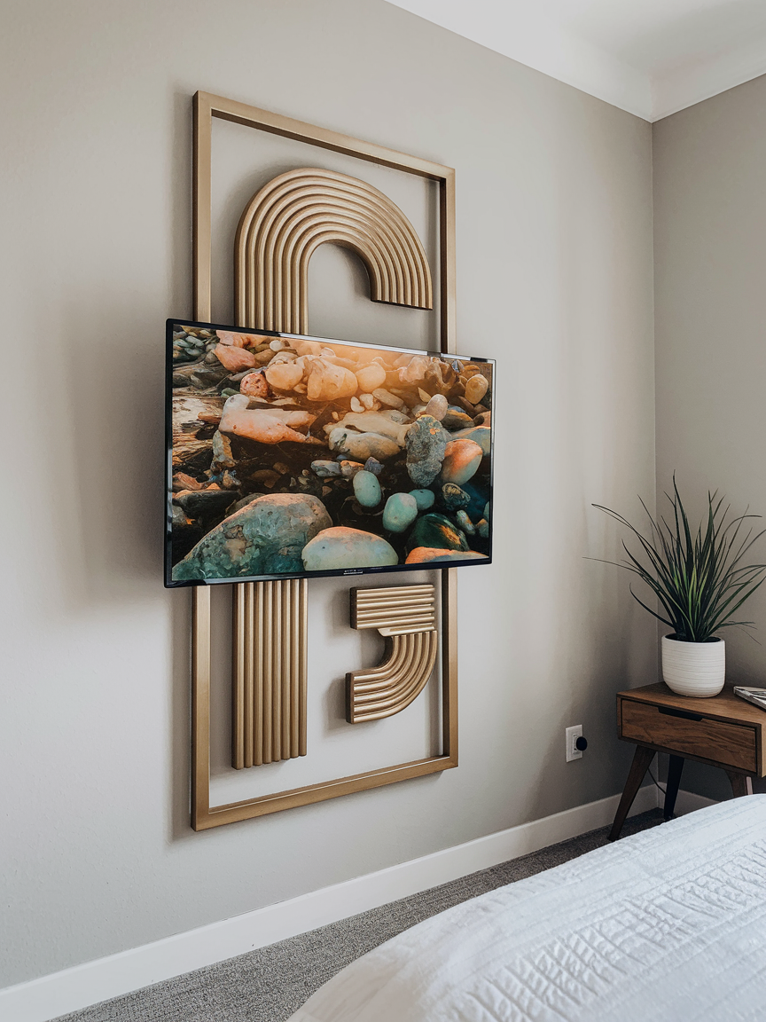 Elevate the design of your bedroom by mounting your TV in an art-like frame. The frame mimics the appearance of a large piece of art, making it feel like a statement piece rather than a typical television. You can customize the frame with different materials, such as gold, silver, or even natural wood, to match your room’s decor. This setup transforms your TV into a functional art piece, adding an extra layer of sophistication to your space.