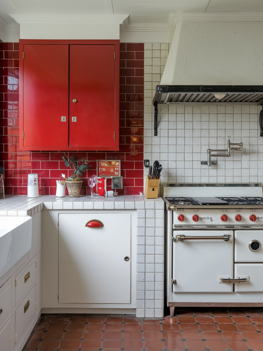 Red and white create a vibrant and energetic kitchen that feels lively and full of character. The boldness of red adds excitement and visual interest, while white ensures the space remains balanced and open. This combination works well for those who enjoy expressive and dynamic interiors. When used thoughtfully, red can become a striking focal point that energizes the entire space without overwhelming it.