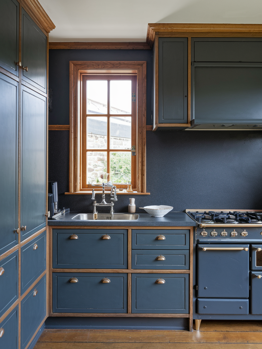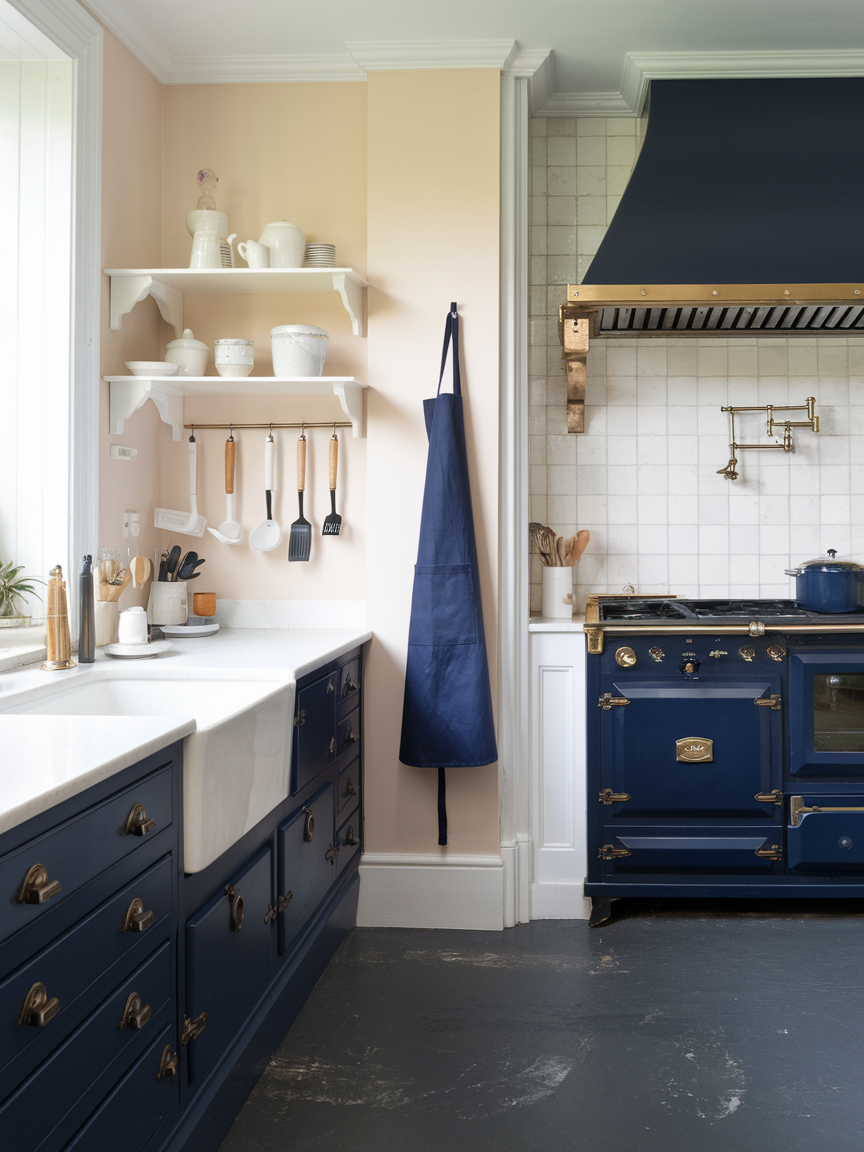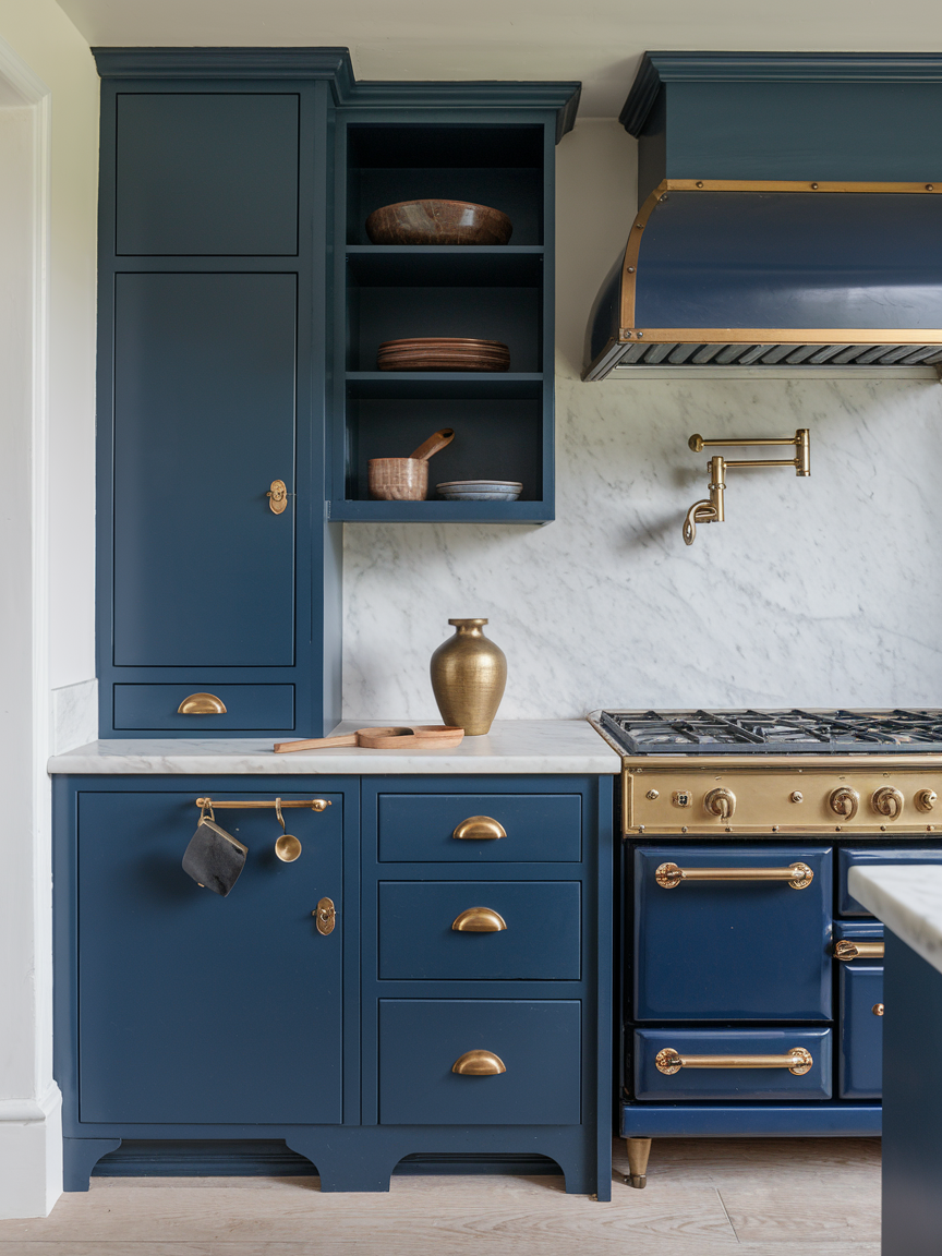 Navy blue combined with brass accents creates a rich and elegant kitchen aesthetic that feels both bold and refined. The deep blue introduces a sense of depth and sophistication, while brass hardware and fixtures add warmth and a subtle glow. This pairing creates a luxurious contrast that feels intentional and curated. When balanced with lighter elements such as white countertops or light wood flooring, the overall look remains inviting rather than heavy. The combination is perfect for those who want a dramatic yet timeless kitchen that feels both stylish and welcoming.