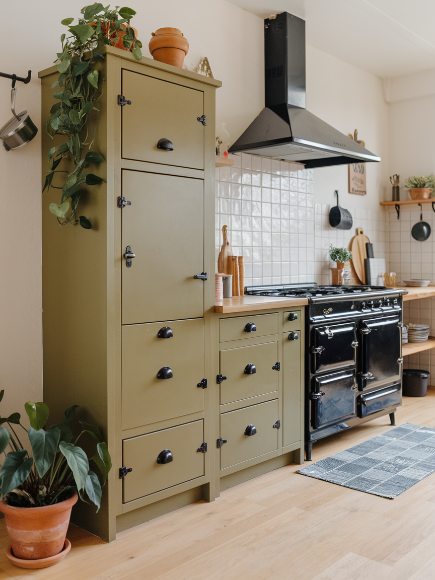 Olive green and black form a rich, grounded color combination that brings depth and modern sophistication into the kitchen. Olive green introduces an earthy, organic quality, while black adds contrast, structure, and a sense of bold refinement. Together, they create a space that feels both contemporary and connected to nature. This palette works especially well with textured materials such as stone backsplashes, matte finishes, or natural wood countertops. Metallic accents like brass or bronze can further elevate the look by adding warmth and subtle shine. Cooking in this environment feels immersive and stylish, offering a balance between comfort and edge. The result is a kitchen that feels intentional, dramatic, and uniquely refined without losing its welcoming appeal.