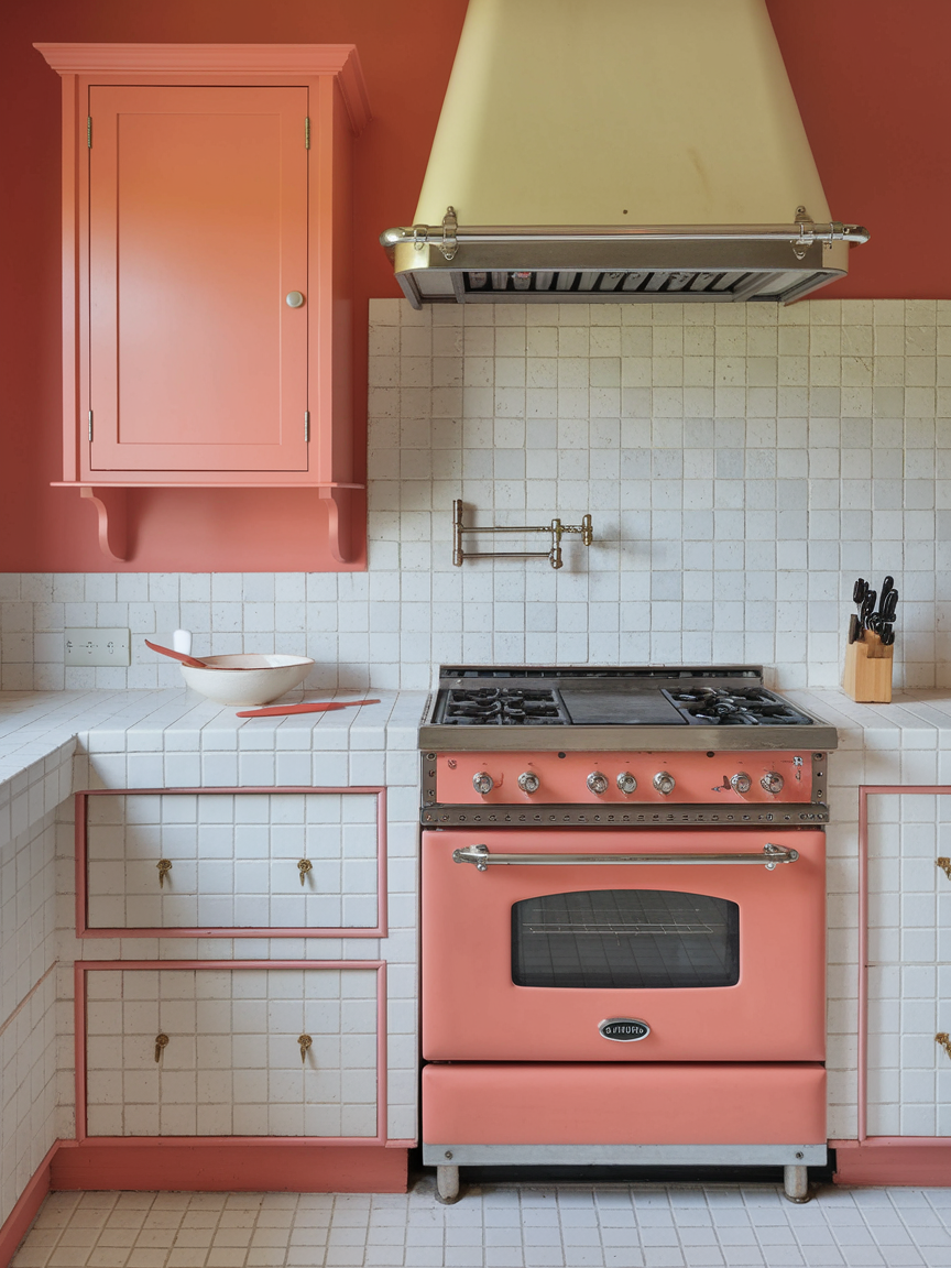 Coral and white bring a lively, cheerful energy into the kitchen while maintaining a sense of balance and freshness. Coral introduces warmth and vibrancy, instantly brightening the space, while white ensures the overall look remains clean and uncluttered. This combination is perfect for creating a kitchen that feels welcoming and full of personality without becoming overwhelming. Coral can be incorporated through cabinetry, accent walls, or decorative elements, while white provides a consistent backdrop that enhances light and openness. Pairing this palette with light wood or subtle metallic finishes helps ground the design and add sophistication. Cooking in a coral and white kitchen feels uplifting and energizing, making it a perfect setting for both daily routines and social gatherings.