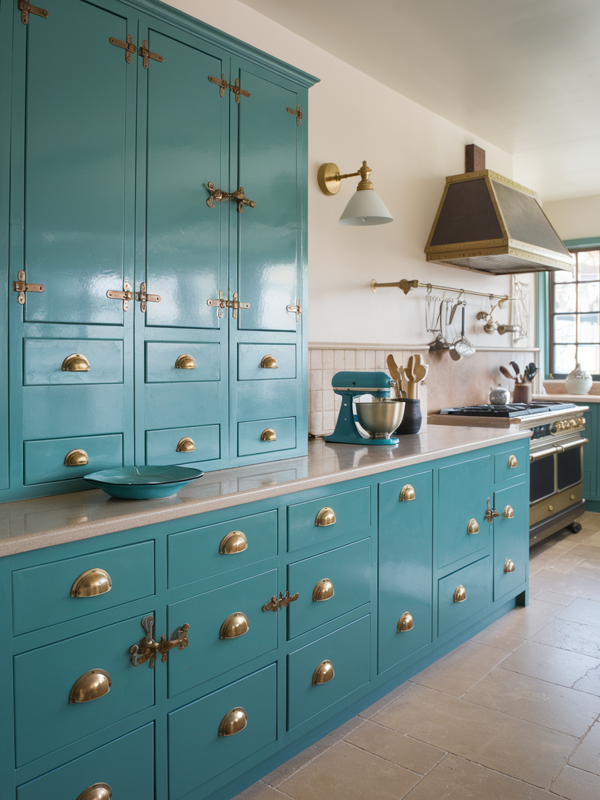 Teal and brass create a luxurious and visually striking kitchen that feels both bold and refined. The richness of teal adds depth and character, while brass accents introduce warmth, elegance, and a touch of glamour. This combination works beautifully in both modern and transitional kitchens, where the contrast between color and metal creates a dynamic yet balanced look. Neutral countertops or natural wood elements can help soften the intensity and keep the space cohesive. Lighting plays an important role here, as it enhances the reflective quality of brass and deepens the tone of teal surfaces. Cooking in a teal and brass kitchen feels elevated and inspiring, transforming everyday moments into something more stylish and memorable.