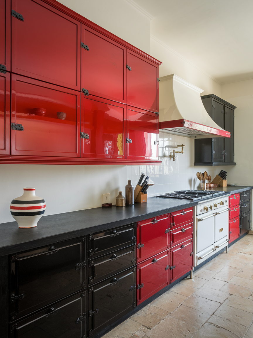 Red and black create a bold, high-impact kitchen design that exudes confidence and modern flair. Red brings energy, passion, and intensity, while black adds depth, contrast, and a sleek edge. This combination is ideal for those who want their kitchen to stand out and make a strong visual statement. To keep the space from feeling too heavy, incorporating neutral elements like white countertops or metallic finishes can help balance the palette. Glossy surfaces or strategic lighting can also enhance the vibrancy of red and the sophistication of black. Cooking in a red and black kitchen feels dynamic and exciting, creating an environment that inspires creativity and bold expression.