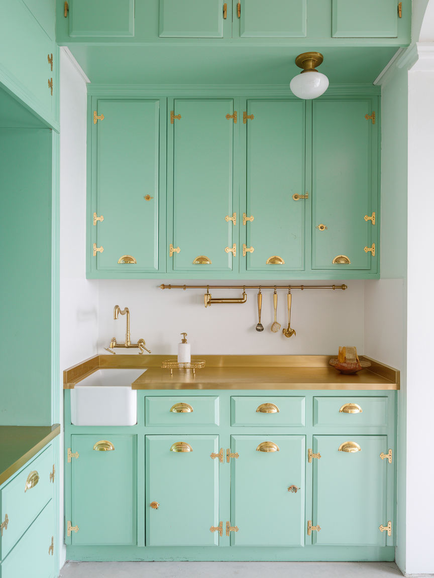Mint and gold offer a fresh yet luxurious kitchen aesthetic that feels both playful and refined. Mint brings a light, airy quality that brightens the space, while gold accents introduce warmth and a subtle sense of glamour. This combination works beautifully in kitchens that aim to feel modern yet inviting. White or light wood elements can be added to maintain balance and prevent the palette from feeling overly decorative. Gold hardware, lighting, or fixtures catch the light and enhance the overall elegance. Cooking in a mint and gold kitchen feels uplifting and stylish, creating a space that feels cheerful yet polished.