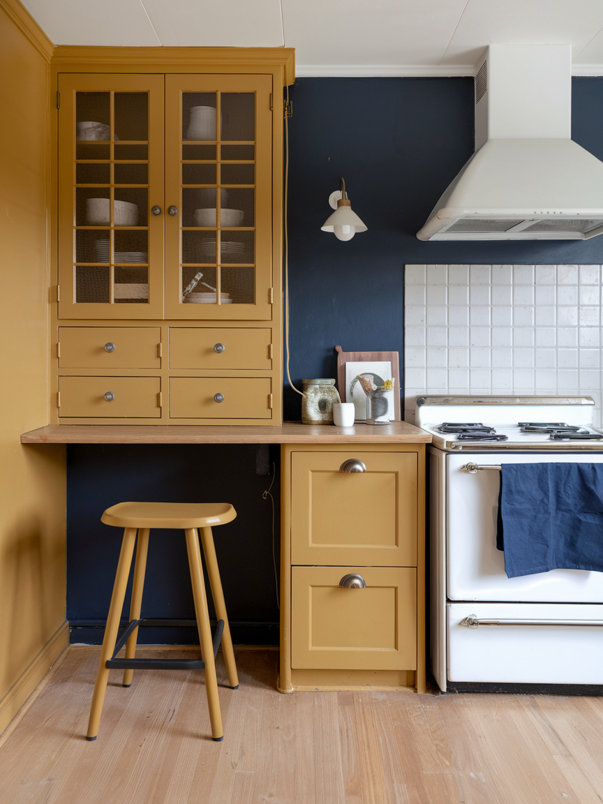 Mustard and navy create a bold and sophisticated kitchen palette that balances warmth and depth beautifully. Mustard adds vibrancy and a touch of retro charm, while navy grounds the space with its rich, calming presence. This pairing works well in both modern and eclectic kitchens, especially when combined with neutral countertops or natural wood accents. The contrast between the two colors creates visual interest without feeling chaotic. Thoughtful lighting can further enhance the richness of navy and the warmth of mustard. Cooking in this environment feels energetic yet controlled, resulting in a kitchen that feels stylish, unique, and full of personality.