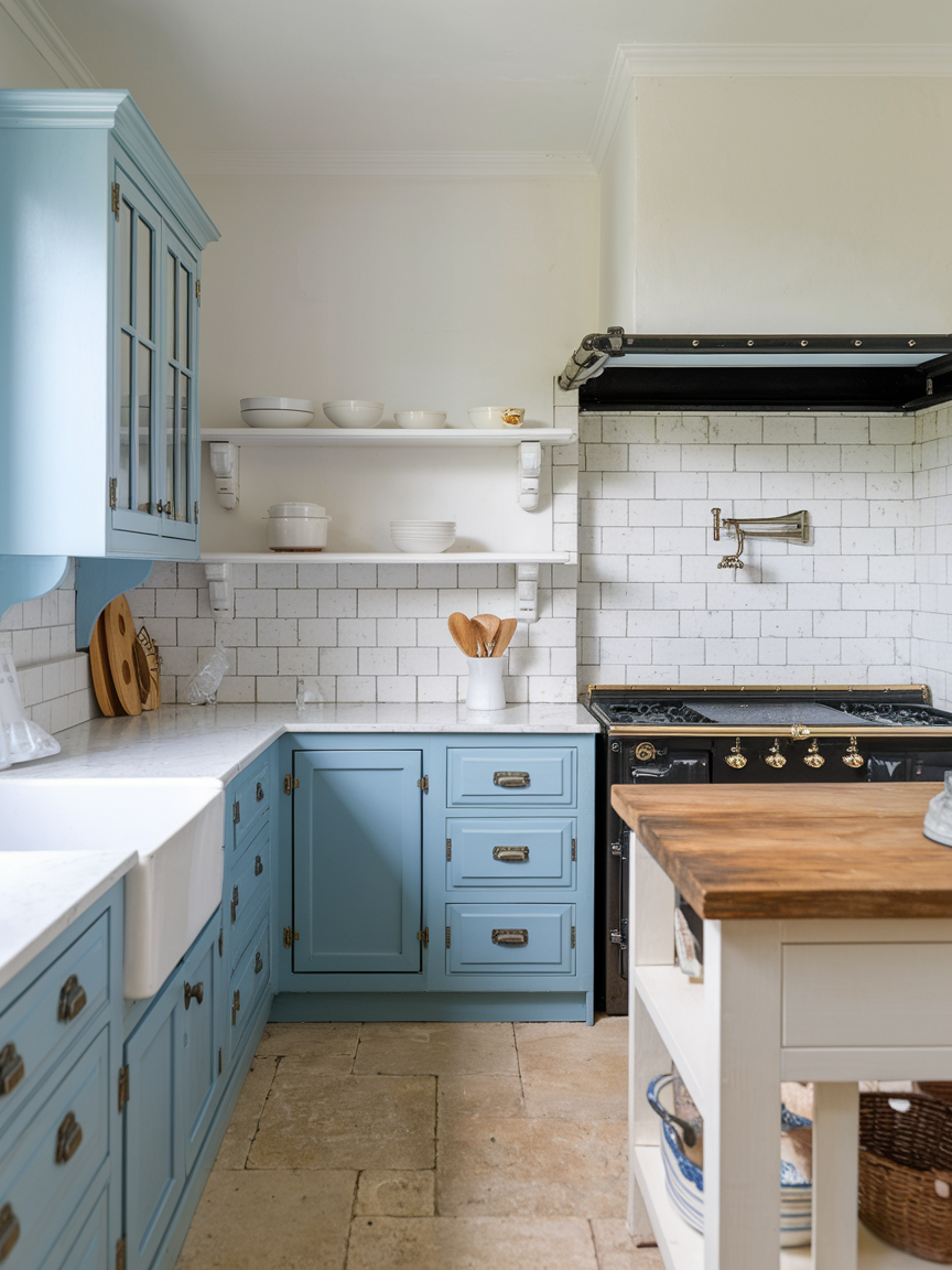 Sky blue and white create a bright, airy kitchen that feels open and refreshing. The soft blue tone adds a hint of color that evokes calmness and clarity, while white enhances light and creates a sense of spaciousness. This combination is perfect for kitchens that aim to feel relaxed and inviting, especially in smaller spaces. Adding natural materials like wood or subtle metallic accents can bring warmth and depth. Large windows or reflective surfaces can further amplify the light, making the space feel even more expansive. Cooking in a sky-blue and white kitchen feels uplifting and peaceful, offering a pleasant environment for both daily routines and casual gatherings.