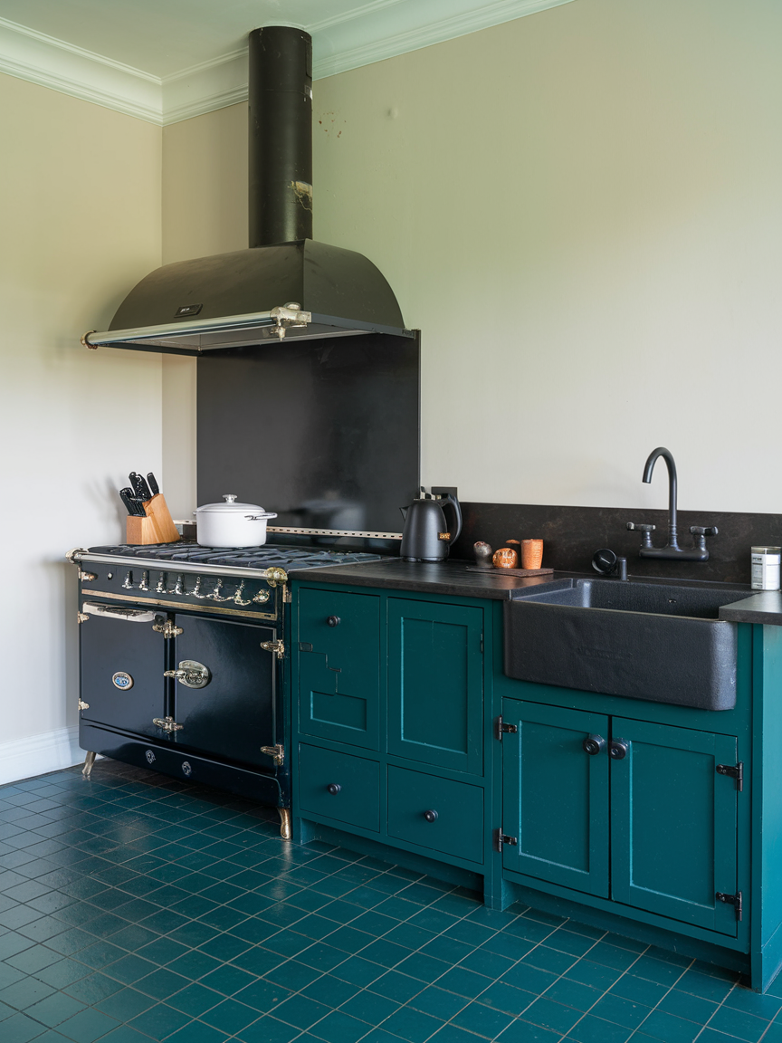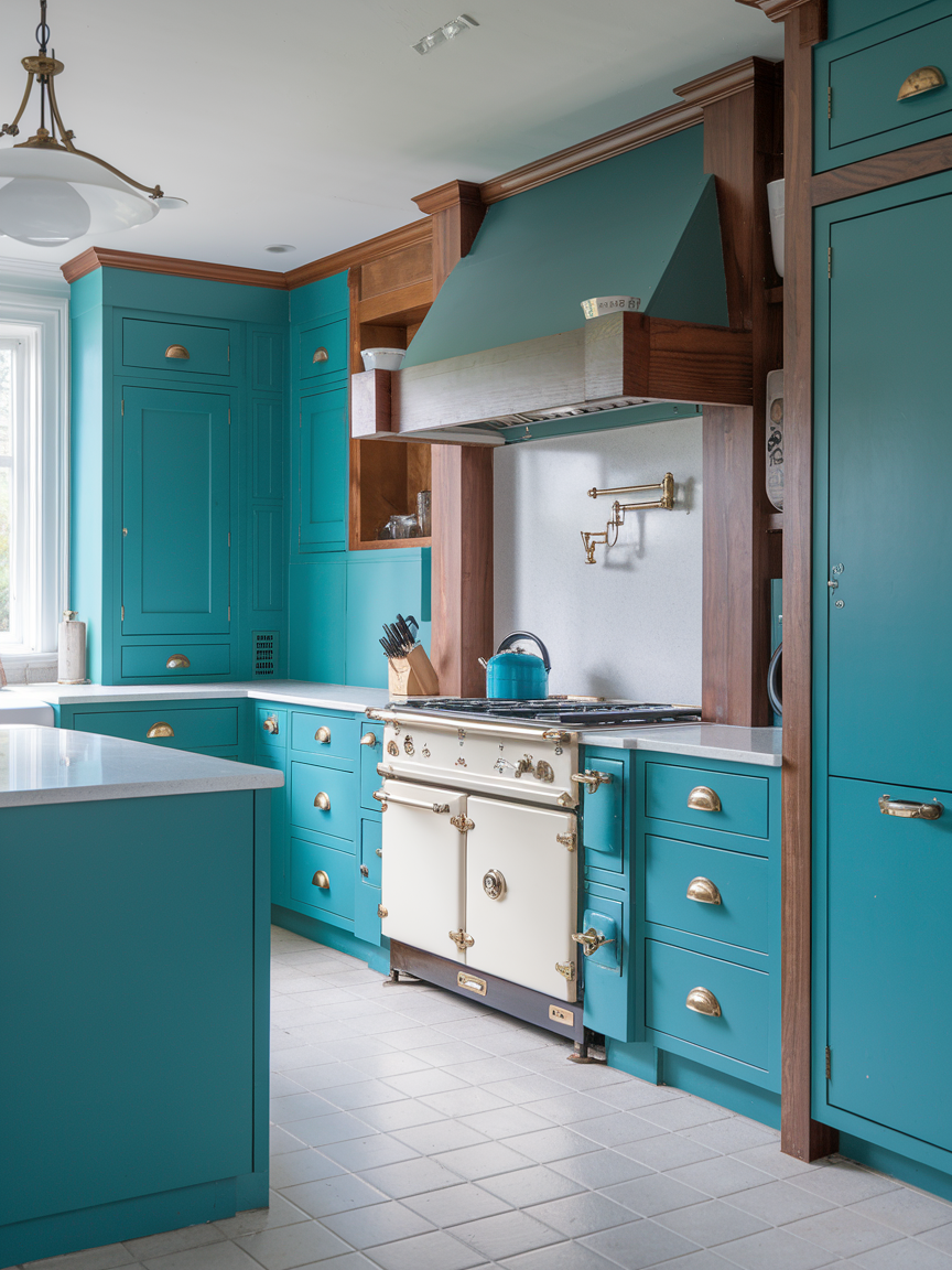 Teal paired with walnut wood creates a rich and layered kitchen design that feels warm, inviting, and sophisticated. The deep teal adds character and visual depth, while walnut introduces natural warmth and texture. This combination strikes a perfect balance between bold color and organic materials. Metallic accents such as brass or matte black can further enhance the look, adding refinement without overpowering the design. The result is a kitchen that feels thoughtfully curated and full of depth.
