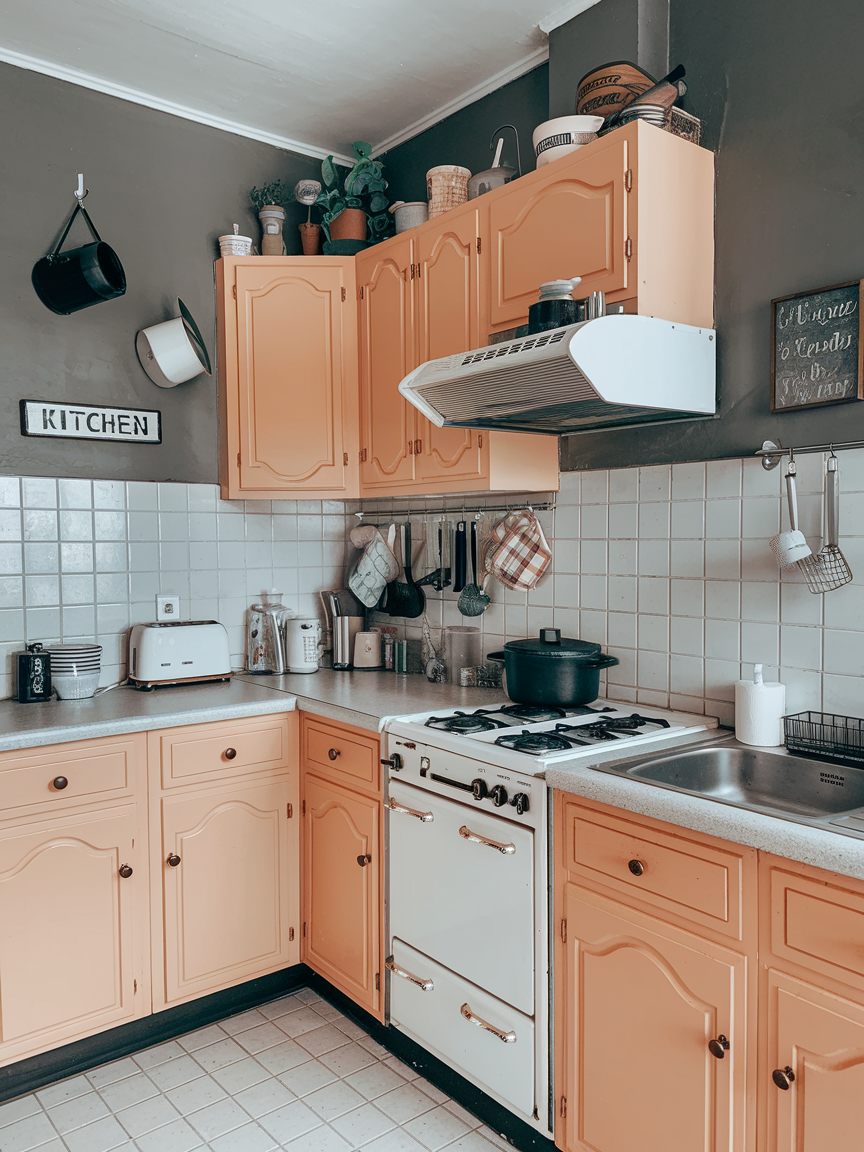 Peach and grey create a soft yet contemporary kitchen aesthetic that balances warmth with modern sophistication. Peach introduces a gentle, inviting tone that feels cozy and approachable, while grey keeps the palette grounded and refined. This combination works well in kitchens that aim for a subtle personality without overwhelming the space. Pairing these colors with white or wooden elements can enhance harmony and add depth. Soft lighting further enhances the warmth of peach and the calmness of grey. Cooking in this kitchen feels relaxed and enjoyable, resulting in a space that feels stylish, welcoming, and thoughtfully designed.