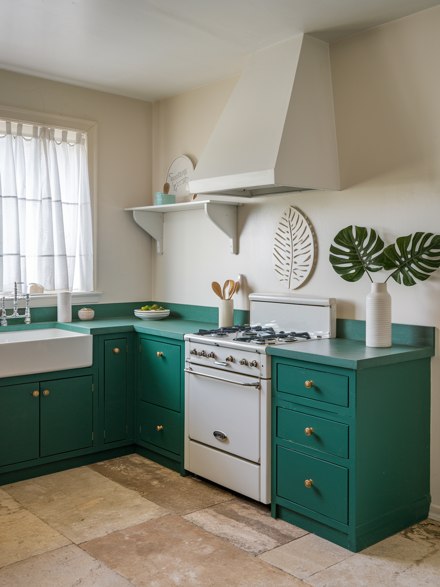 Forest green and white offer a harmonious blend of natural richness and crisp clarity. The deep green evokes a sense of calm and connection to nature, while white provides brightness and balance. This combination creates a kitchen that feels fresh, grounded, and welcoming at the same time. Incorporating natural materials such as wood, stone, or woven textures enhances the organic feel of the palette. The contrast between dark and light tones adds visual interest, making the space feel dynamic without being overwhelming.