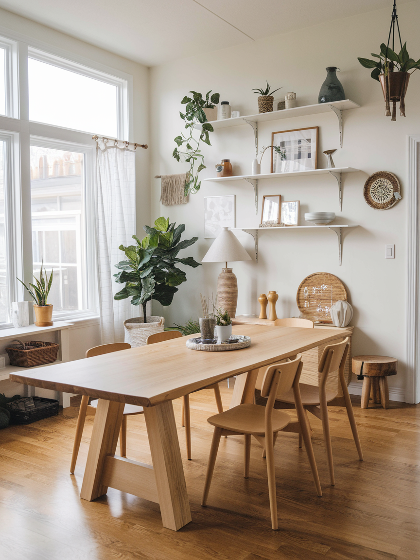 A solid natural wood dining table serves as the heart of a modern boho dining room, grounding the space with warmth and organic texture. Choose finishes like light oak, mango wood, or walnut to create a timeless and earthy base. Clean lines and simple silhouettes keep the look modern, while visible wood grain adds character and authenticity. This balance between structure and nature defines modern boho style. Pair the table with neutral surroundings and layered textures to allow its natural beauty to stand out. The warmth of wood softens the space and makes gatherings feel relaxed and welcoming. A well-chosen wooden table not only anchors the design but also creates a lasting focal point that feels both functional and effortlessly stylish.