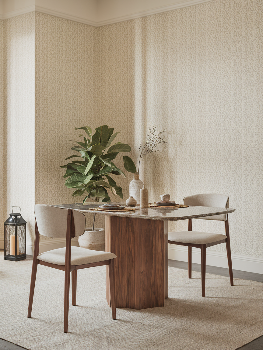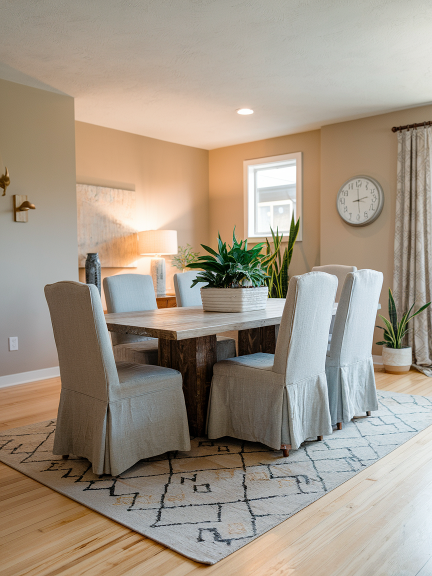 Neutral upholstered dining chairs create comfort while maintaining visual harmony. Linen, cotton, or boucle fabrics in shades of cream, taupe, or warm gray soften the space and complement natural materials. Clean silhouettes keep the design contemporary, while subtle texture adds depth. Neutral seating also allows accent colors from decor and textiles to stand out. This balanced foundation ensures the room feels cohesive, comfortable, and effortlessly elegant.