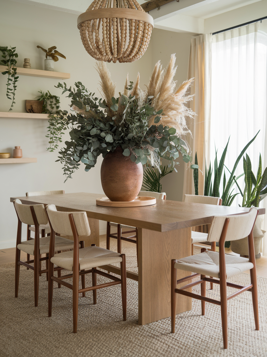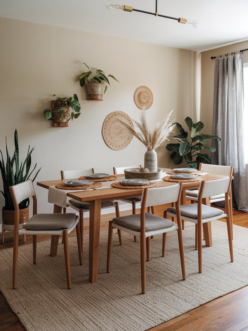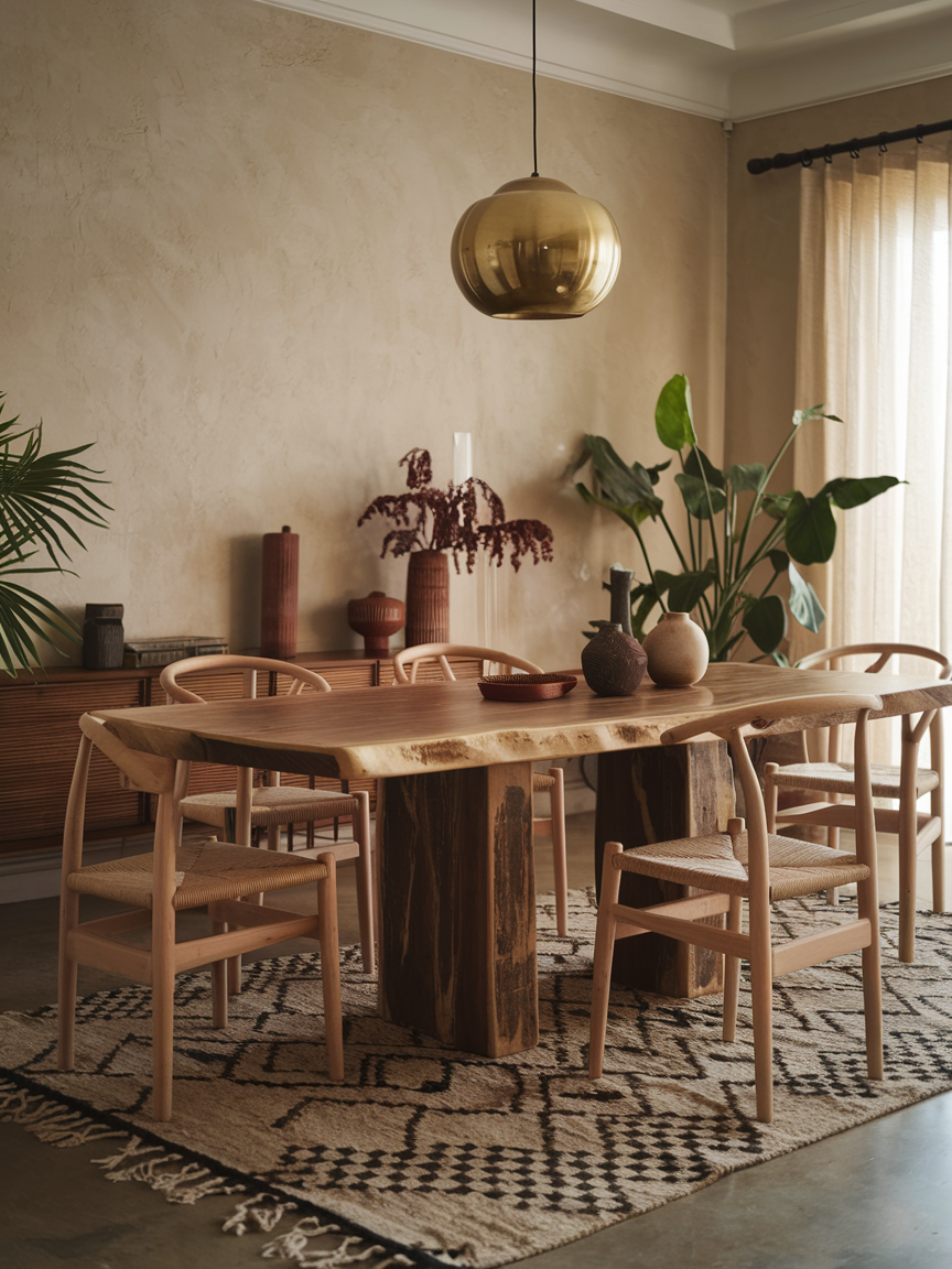 Combining multiple natural materials creates the layered richness that defines modern boho interiors. Wood furniture, rattan lighting, linen textiles, ceramic decor, and woven rugs work together to add depth without clutter. Keeping colors within an earthy palette ensures harmony despite the variety of textures. The contrast between smooth and tactile surfaces keeps the space visually interesting while maintaining balance. This layered approach prevents the room from feeling flat or overly minimal. The result is a warm, inviting dining environment that feels organic, relaxed, and thoughtfully composed.