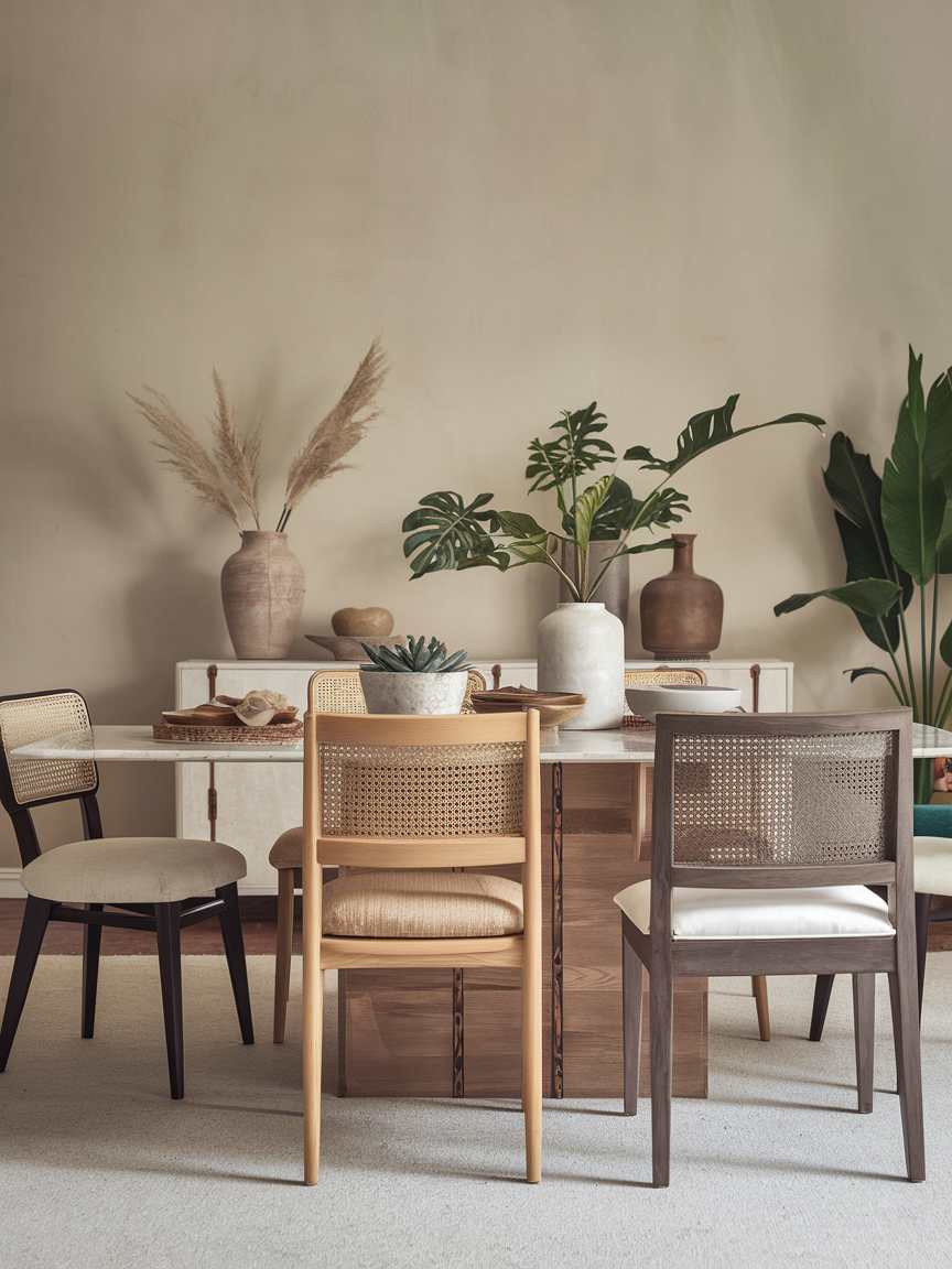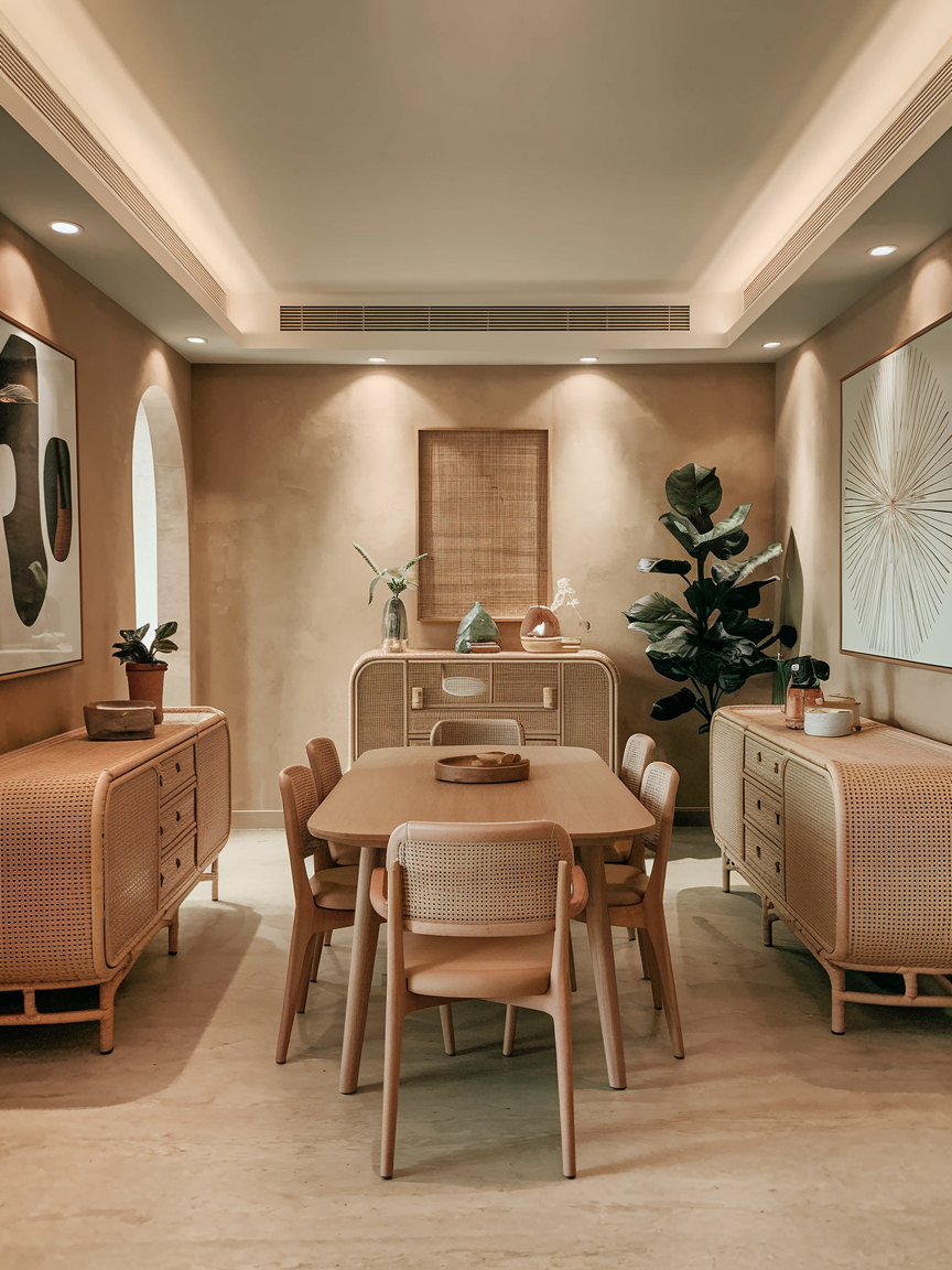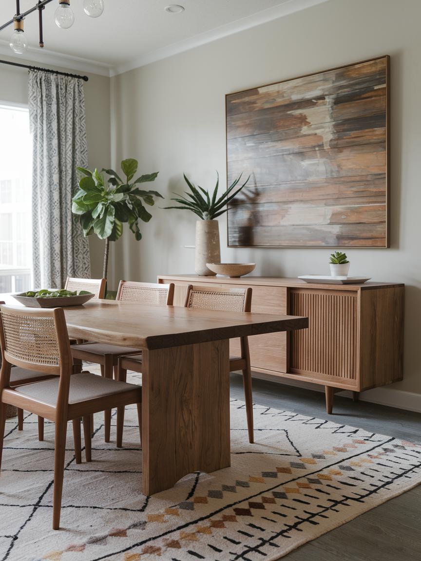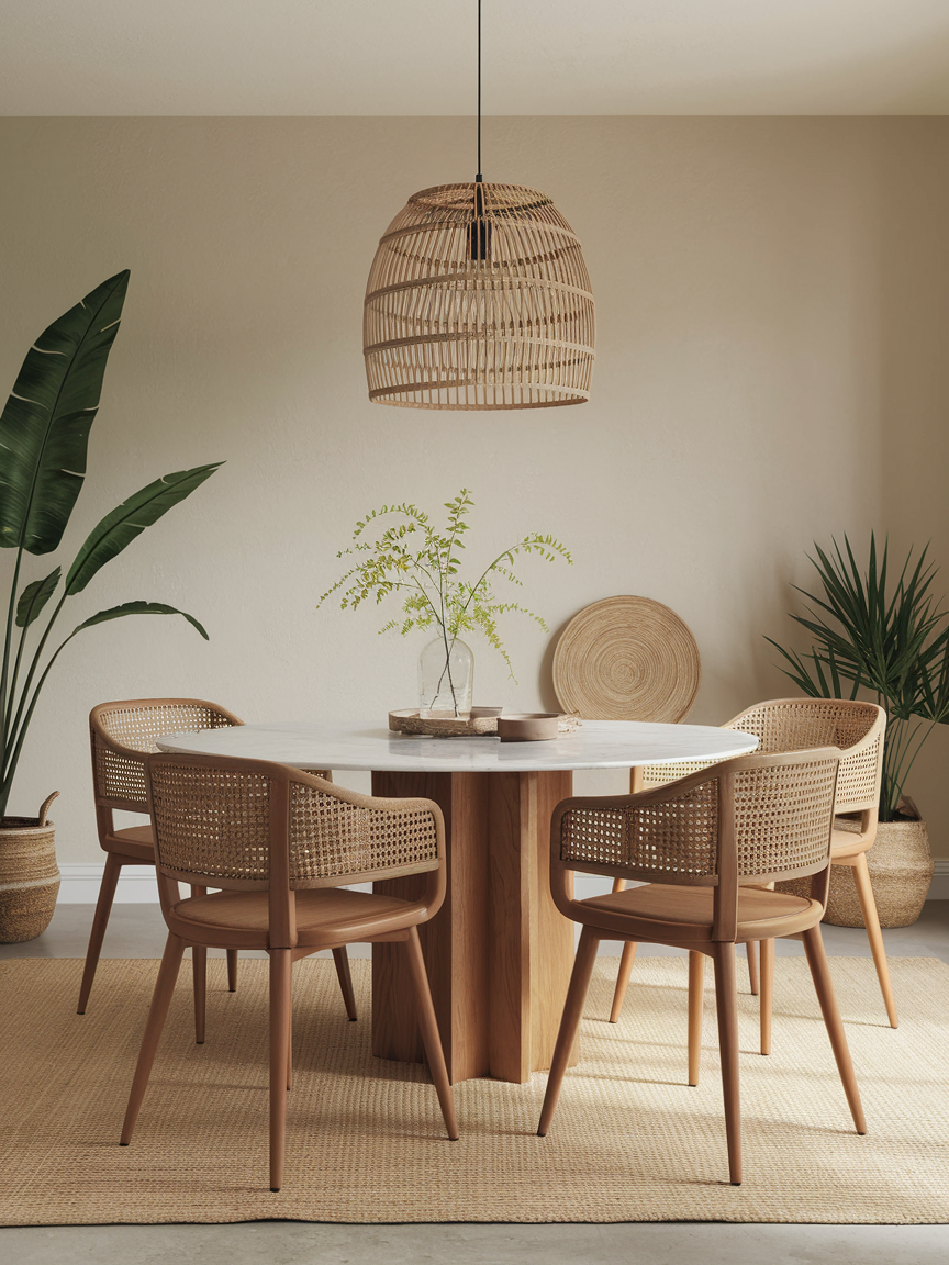 Combining multiple natural materials creates the layered richness that defines modern boho interiors. Wood furniture, rattan lighting, linen textiles, ceramic decor, and woven rugs work together to add depth without clutter. Keeping colors within an earthy palette ensures harmony despite the variety of textures. The contrast between smooth and tactile surfaces keeps the space visually interesting while maintaining balance. This layered approach prevents the room from feeling flat or overly minimal. The result is a warm, inviting dining environment that feels organic, relaxed, and thoughtfully composed.