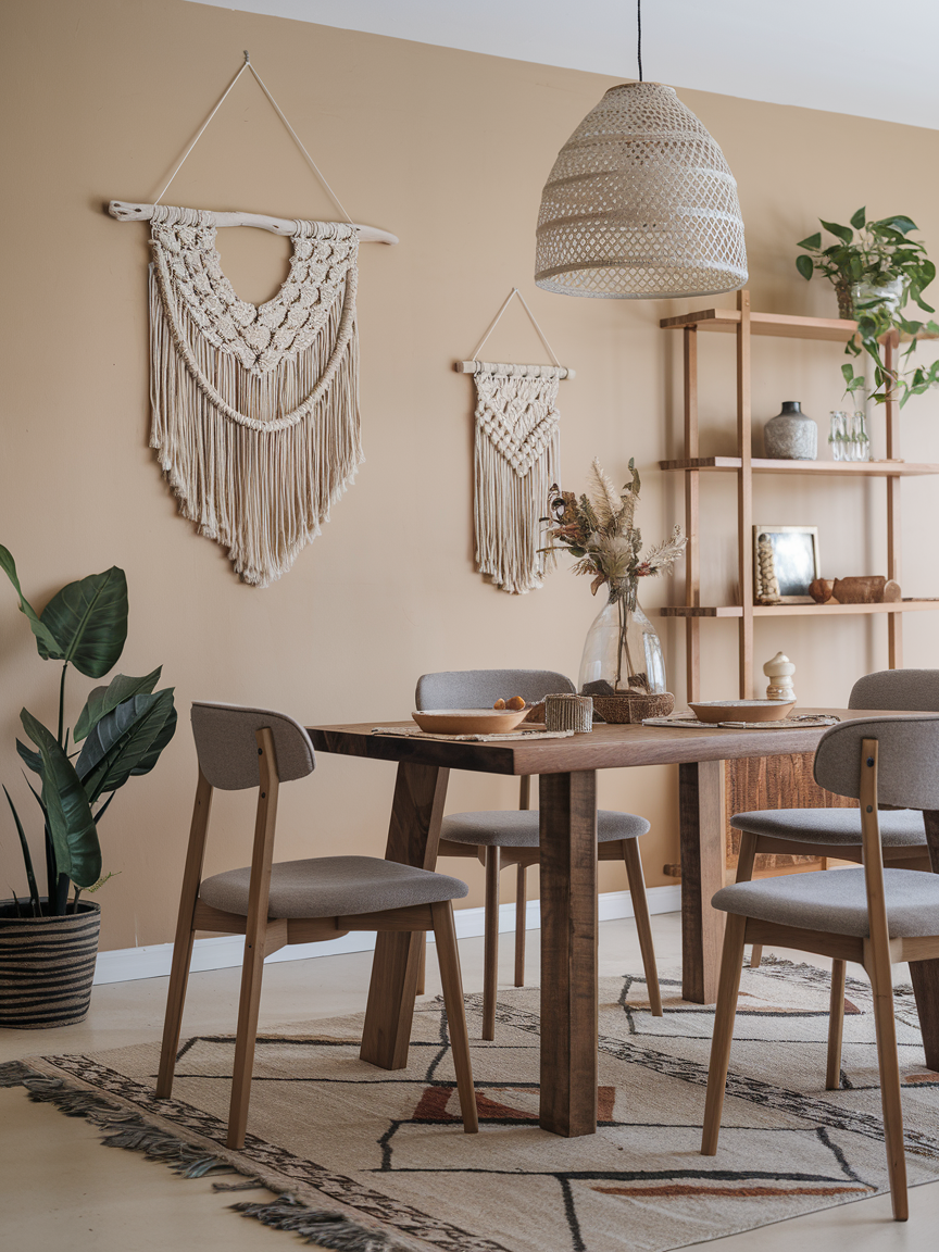 Macramé introduces handcrafted charm and texture, but in a modern boho dining room, it should be used thoughtfully and sparingly. A single wall hanging, chair accent, or decorative piece adds softness and artisanal character without overwhelming the clean design. Choose neutral fibers such as cotton or jute to maintain cohesion with the earthy palette. Keeping the pattern simple and avoiding overly intricate designs helps preserve a contemporary feel. The woven texture contrasts beautifully with smooth surfaces like wood, ceramic, and glass, adding depth to the space. When paired with natural light and minimal decor, macramé enhances the relaxed, collected aesthetic that defines modern boho style while keeping the overall look refined and uncluttered.