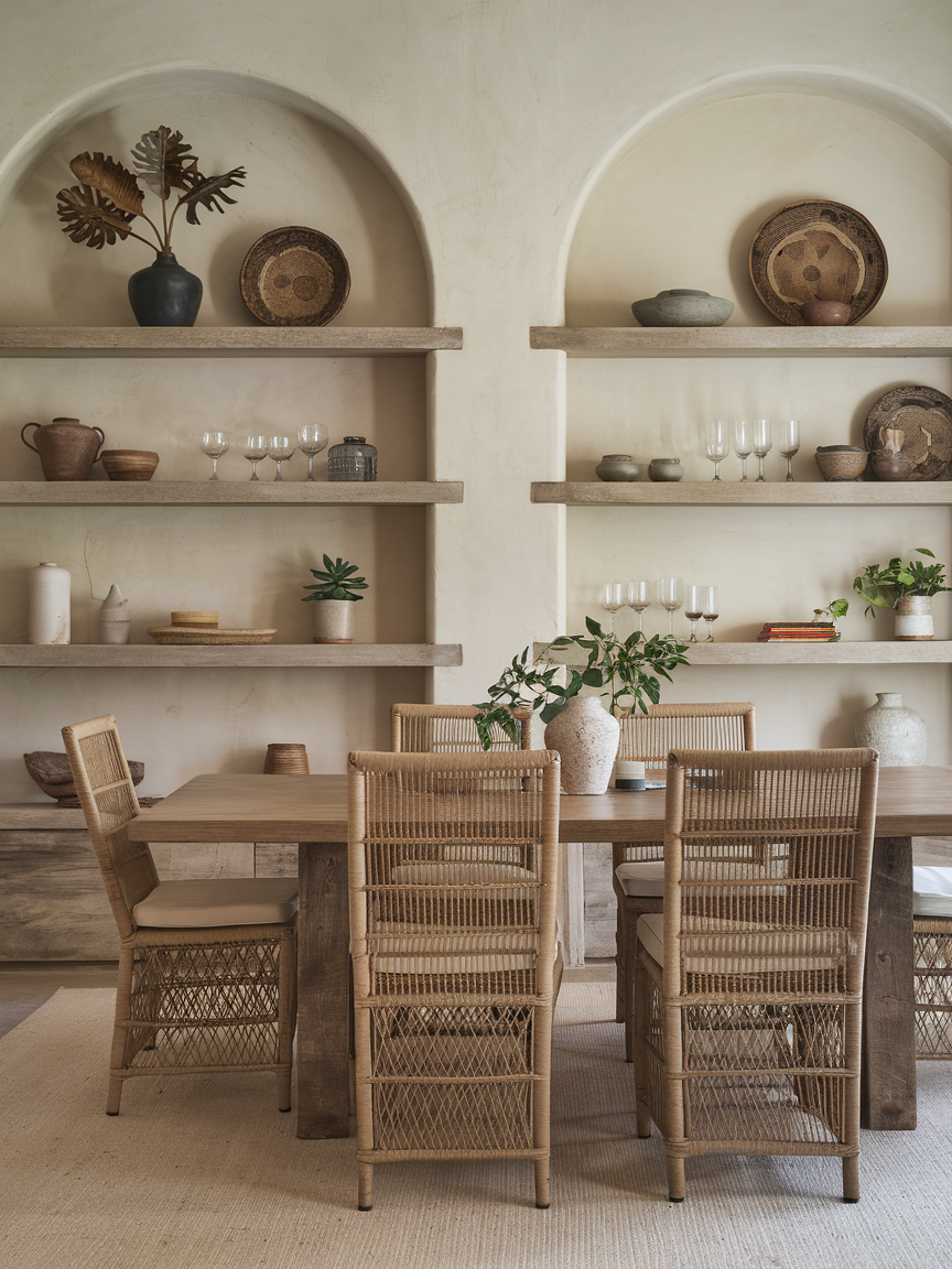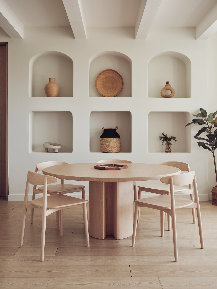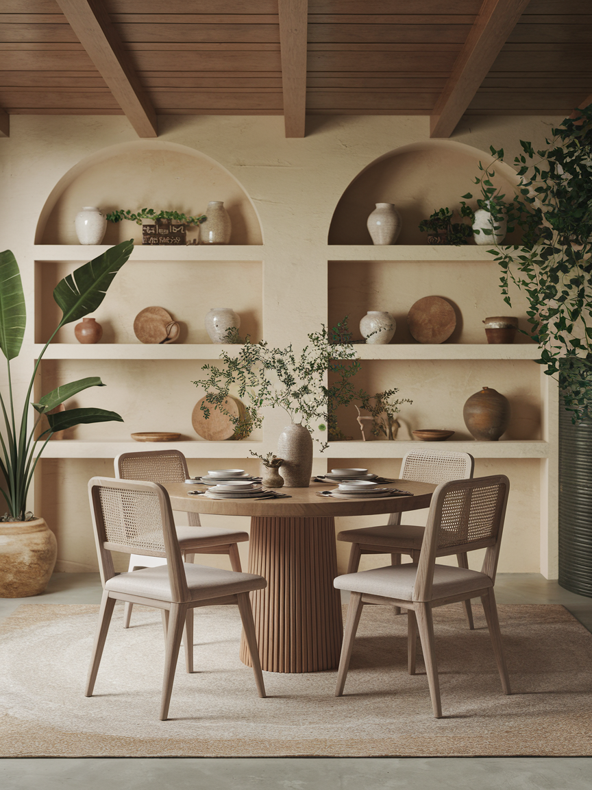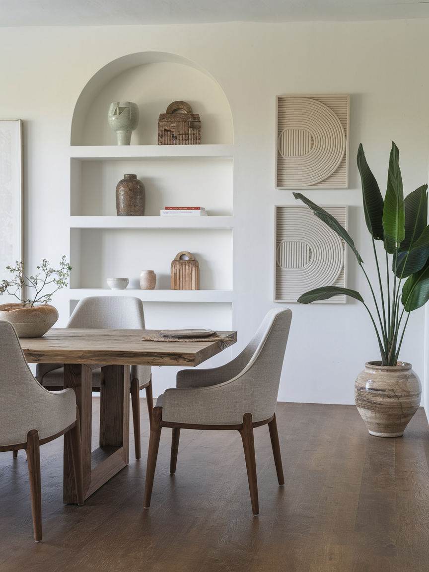 Built-in wall niches offer a beautiful way to display decorative pieces while maintaining the clean, airy feel essential to a modern boho dining room. Unlike bulky cabinets or shelving units, niches are integrated directly into the wall, creating storage and display space without interrupting the room’s flow. Painting the interior the same color as the surrounding wall keeps the look seamless and calm, while a slightly contrasting earthy tone can add subtle depth. Style niches with a curated selection of ceramics, small plants, woven baskets, or sculptural objects, leaving enough negative space to avoid visual clutter. The recessed design naturally highlights each item, giving it a gallery-like presence. This architectural feature adds character and functionality while supporting the relaxed, intentional styling that defines modern boho interiors.