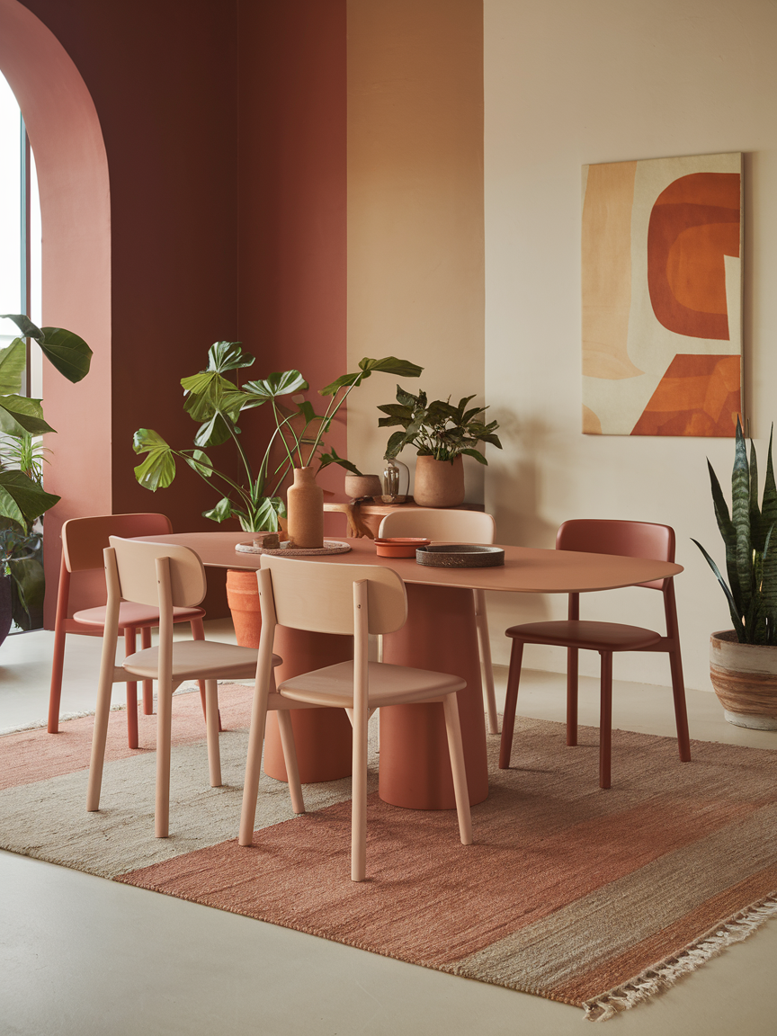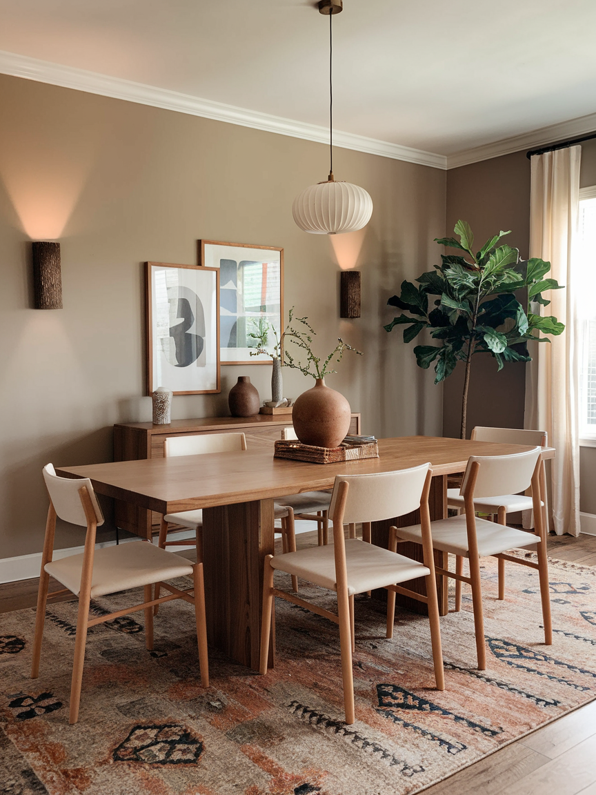 An earthy color palette sets the tone for a modern boho dining room. Shades like terracotta, sand, olive green, warm beige, and soft clay create a calming and grounded environment. These colors work beautifully with natural materials and layered textures, reinforcing the connection to nature. Keeping walls neutral allows accent colors to appear through textiles, ceramics, or artwork without overwhelming the space. Earth tones also create a cozy atmosphere that feels inviting for everyday meals and gatherings. The subtle warmth of this palette ensures the room feels relaxed yet refined, achieving a harmonious balance between modern simplicity and bohemian richness.