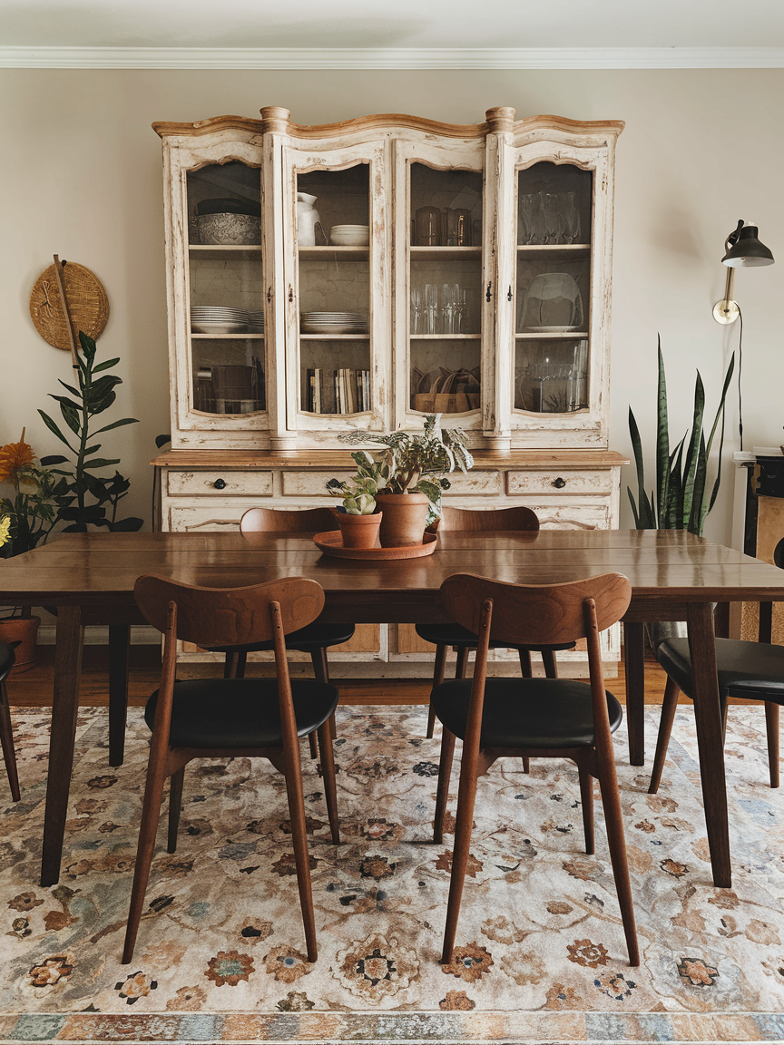 Incorporating a vintage or reclaimed piece adds history and individuality to a modern boho dining room. An antique chair, distressed cabinet, or weathered wood table introduces character that contrasts beautifully with newer elements. The natural patina and imperfections tell a story, reinforcing the collected and lived-in feel of boho design. To keep the look modern, balance vintage items with clean-lined furniture and a restrained color palette. One statement piece is usually enough to create impact without making the space feel themed or cluttered. This blend of old and new adds depth and authenticity, ensuring the room feels personal, warm, and thoughtfully curated.
