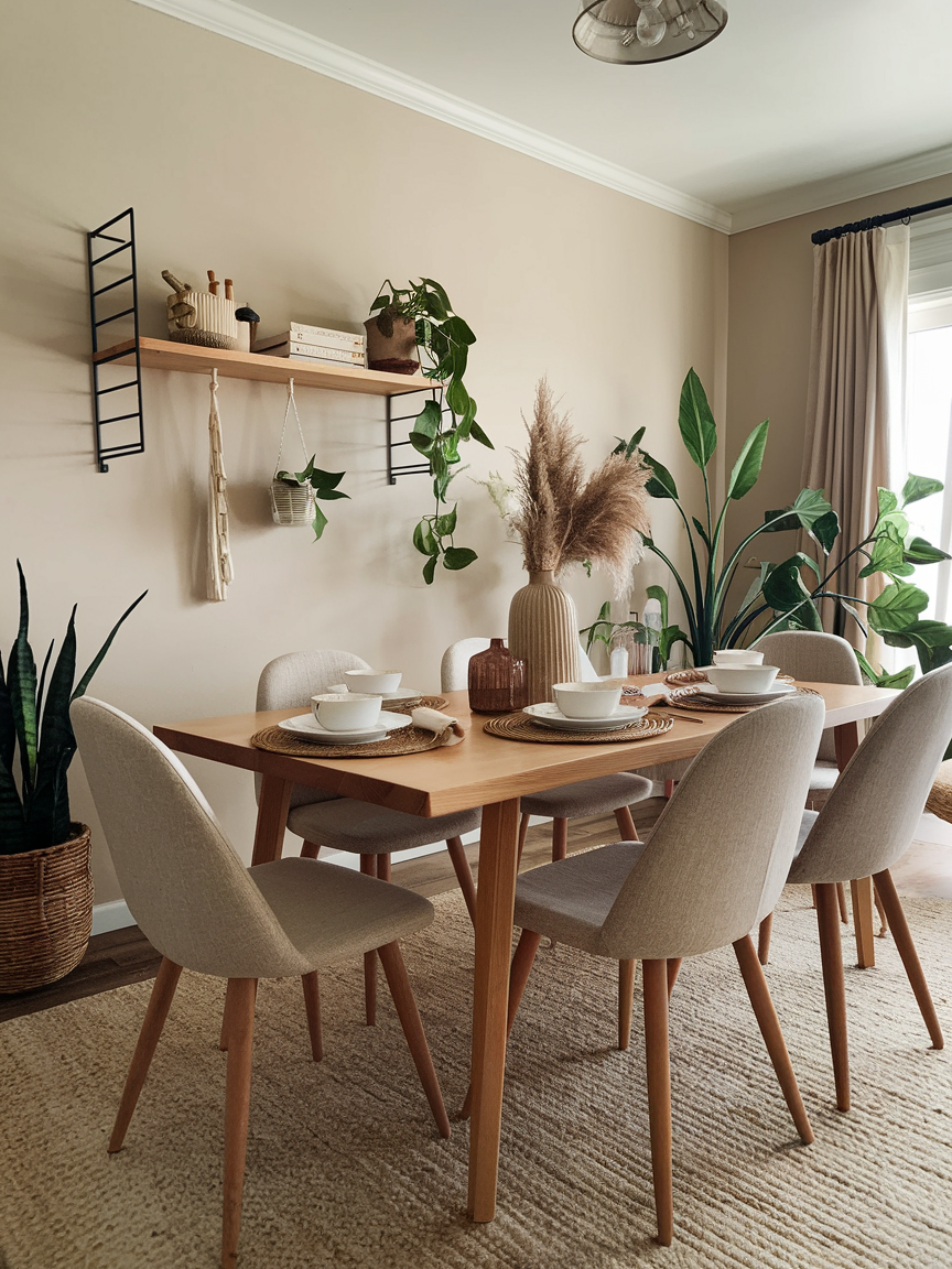 A thoughtfully chosen centerpiece brings life and personality to a modern boho dining table while maintaining simplicity. Natural elements such as dried pampas grass, olive branches, eucalyptus, or seasonal greenery create height and movement without feeling formal or excessive. Placing these elements in a handcrafted ceramic, clay, or glass vase enhances the organic aesthetic. The key is keeping the arrangement loose and natural rather than overly structured. Neutral tones ensure the centerpiece blends harmoniously with the overall palette. This focal point adds warmth and texture while keeping the table functional for daily use. A rotating seasonal arrangement can refresh the space throughout the year without changing the entire decor. This simple styling approach embodies modern boho living—relaxed, natural, and effortlessly beautiful.