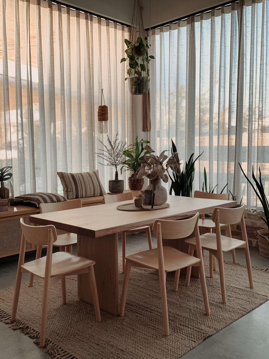 Maximizing natural light enhances the airy and welcoming mood of a modern boho dining room. Large windows allow sunlight to highlight textures, wood tones, and woven materials throughout the space. Sheer linen or cotton curtains provide privacy while still allowing light to filter through softly. Neutral fabrics maintain cohesion and avoid visual heaviness. Mounting curtains higher than the window frame can also make ceilings appear taller. The connection to outdoor light reinforces the natural, relaxed essence of boho design. Bright, sunlit spaces feel more open, comfortable, and inviting for everyday living and gatherings.