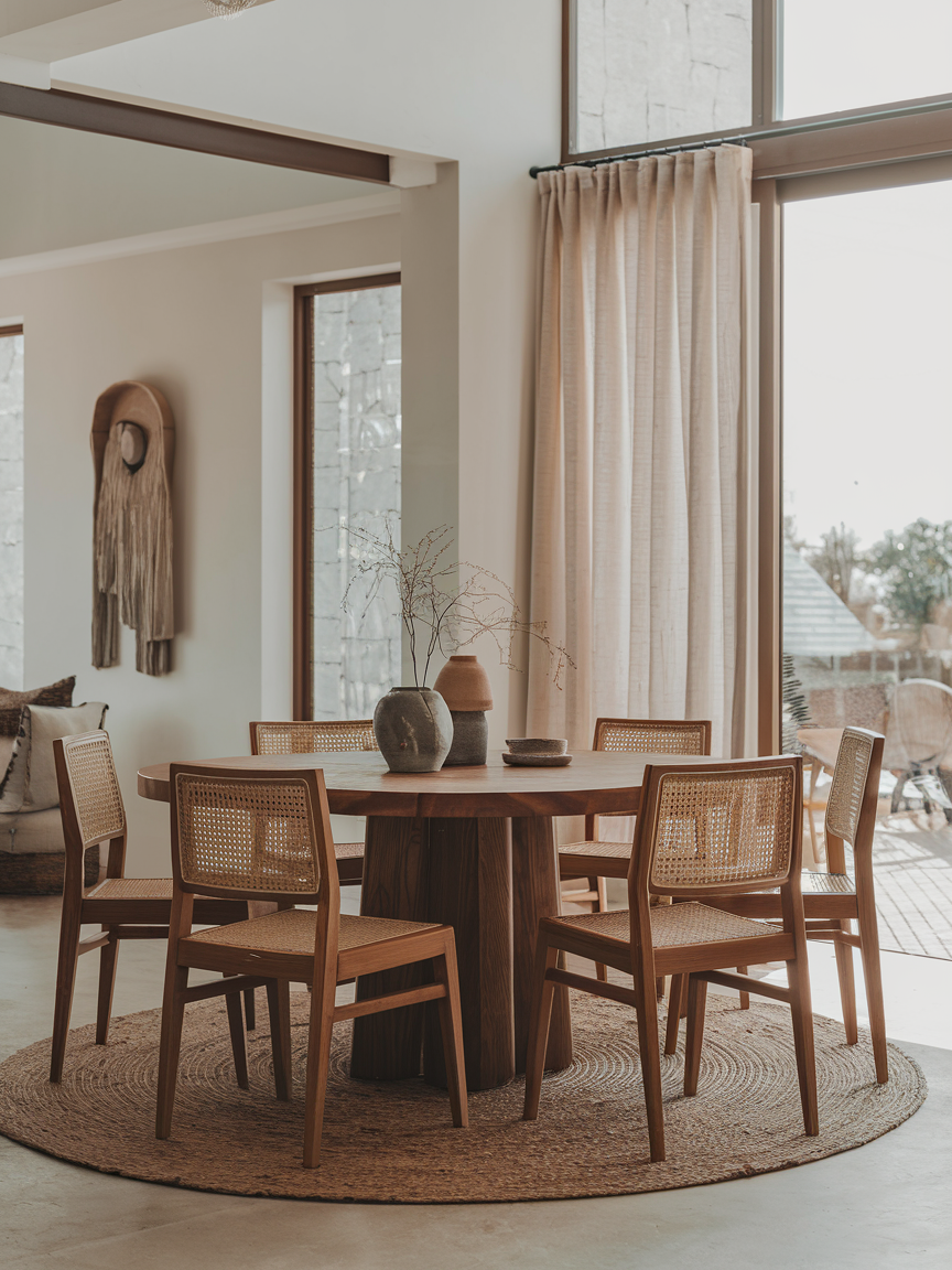 A natural fiber rug helps anchor the dining area while adding warmth, texture, and subtle visual structure. Materials such as jute, sisal, or wool bring an earthy quality that complements wood furniture, woven accents, and neutral color schemes. The organic texture softens hard flooring and improves comfort underfoot, making the space feel more inviting for long meals and gatherings. Choosing a rug large enough to extend beyond the table ensures chairs remain stable when pulled out, improving both function and appearance. Neutral tones keep the look cohesive, while simple weaves or minimal patterns maintain the modern aesthetic. This layered foundation enhances the room’s depth without adding visual heaviness, supporting the relaxed yet refined atmosphere of modern boho design.